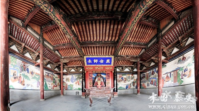 這部藏書是一幅全景式的復(fù)原圖,當(dāng)我們翻開這幅畫卷時(shí),被它所展示的內(nèi)容而震撼了;卓而不群的甘肅省內(nèi)唯一一家規(guī)模宏大,風(fēng)格粗獷,形制古雅,氣勢雄偉,建有孔圣塑像的廟宇,這就是其中的奧妙所在。我們懷著至誠崇敬的心情走上泮池上建造的漢白玉欄桿,桿頭雕刻祥云紋,單拱“狀元橋”,意在為后代求個(gè)“青云直上,金榜題名”的彩頭。再步入泮池后的明代建筑大成門,就進(jìn)到孔圣祭祀的通道。當(dāng)跨過寬大的門檻進(jìn)到文廟主體建筑,明嘉靖四十二年(1563年)重建的大成殿時(shí),更顯得神情莊重,雙眸慢移:大殿坐北朝南,面闊五間,通長14米,進(jìn)深四間,寬10米多,大式土木七檁抬梁造,單檐歇山頂,上覆琉璃瓦,雄偉寬敞,飛檐翹角,雕梁畫棟,斗拱交錯(cuò),威嚴(yán)壯觀。收山、出檐較深,脊飾龍、鳳、牡丹、菊等紋飾,正脊兩端是高高翹起的大吻,中置三獸寶瓶火珠,垂脊和戧脊端口均裝飾脊獸。兩稍間檻墻各嵌有琉璃盤龍一條,左為火龍,右為水龍,盤繞升騰,神態(tài)各異。