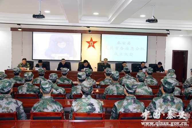 縣政府副縣長扇忠瑜主持成立大會。會上,縣委常委、縣人武部部長姚東峰宣布秦安縣民兵常備應急分隊組織機構;縣民兵應急分隊指導員宣布各班班長命令;應急分隊全體隊員向軍旗進行了宣誓;應急分隊隊員代表向縣領導表決心;縣委常委、政法委書記楊喜春作了講話;縣委常委、政法委書記楊喜春和縣人武部部長姚東峰為《秦安縣民兵常備應急分隊》成立揭牌。