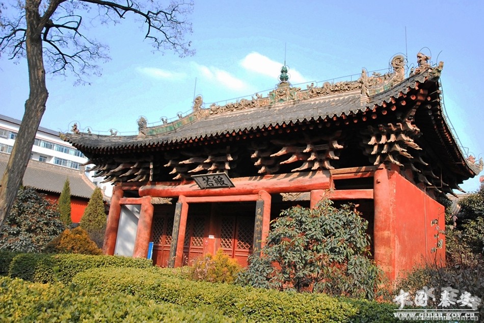 大殿欄額上方懸掛“般若”木匾,為明嘉靖時期邑人胡纘宗所書,是一件珍貴的書法藝術(shù)!按笮蹖毜睢必翌~和楹聯(lián)是由中國文聯(lián)書畫藝術(shù)中心顧問權(quán)希軍所題寫。