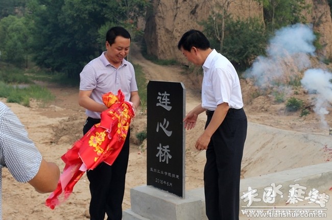 在揭牌儀式上,蘭州工業(yè)學(xué)院黨委書記高永新,秦安縣委副書記裴貴軍分別作了講話并為“連心橋”開通揭牌;潘河村黨支部書記代表全村村民為蘭州工業(yè)學(xué)院贈送了“捐資建橋,造福一方”的錦旗。蘭州工業(yè)學(xué)院校長助理雷在福,縣委常委、副縣長郭雙江,縣委農(nóng)工部、云山鄉(xiāng)政府等單位負(fù)責(zé)人及部分群眾參加了揭牌儀式。