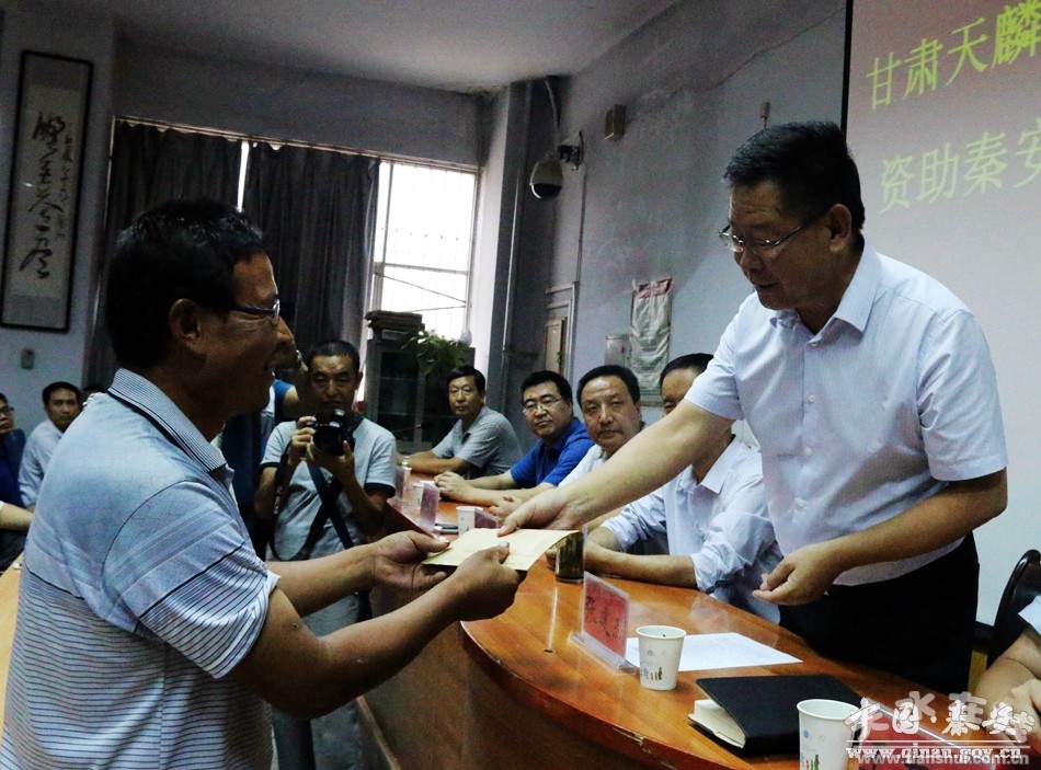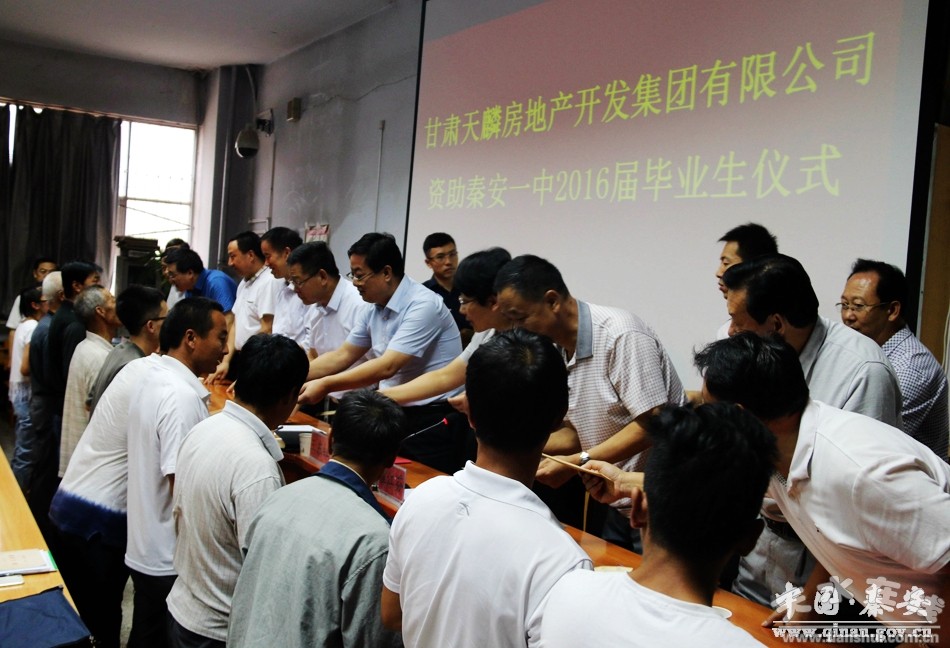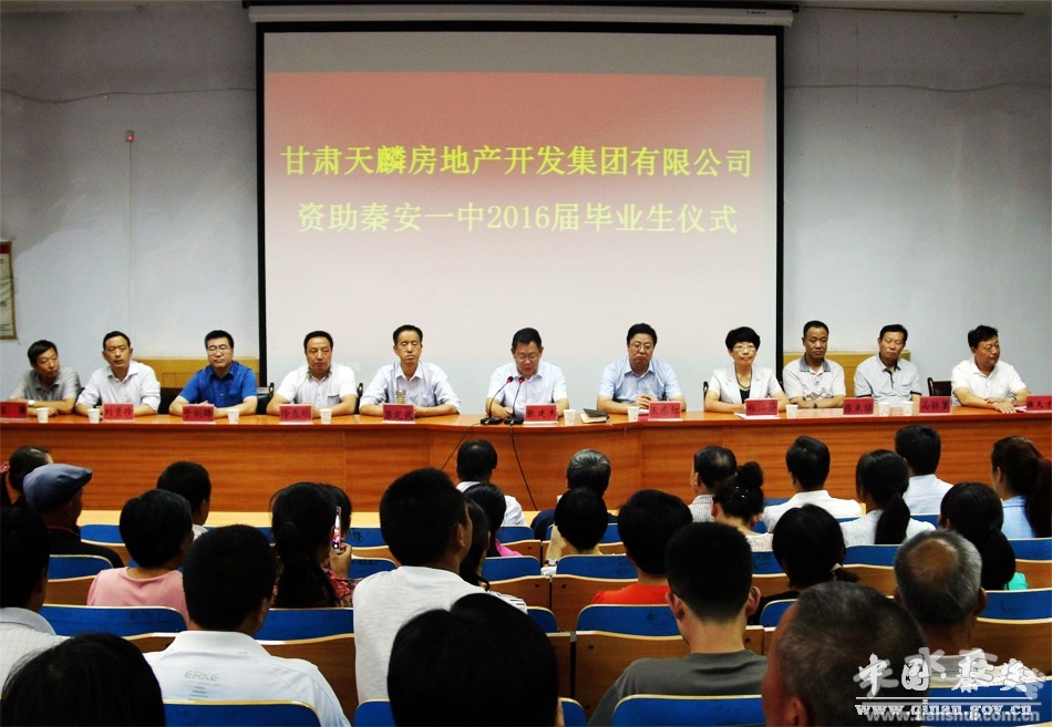 9月2日,甘肅天麟房地產(chǎn)開發(fā)集團有限公司資助秦安一中2016屆畢業(yè)生儀式在秦安縣一中舉行。市政府副市長張建杰出席儀式,市教育局局長蘇定武,縣委書記王東紅,縣委副書記、縣長程江芬,縣委常委、宣傳部長徐東明,縣人大常委會副主任張來祿,縣政府副縣長于劍鋒,縣政協(xié)副主席馬振寰,天麟集團董事長候天才,縣教體局、縣一中、四中部領導班子成員、教師學生代表,以及受資助的學生及家長參加了儀式。