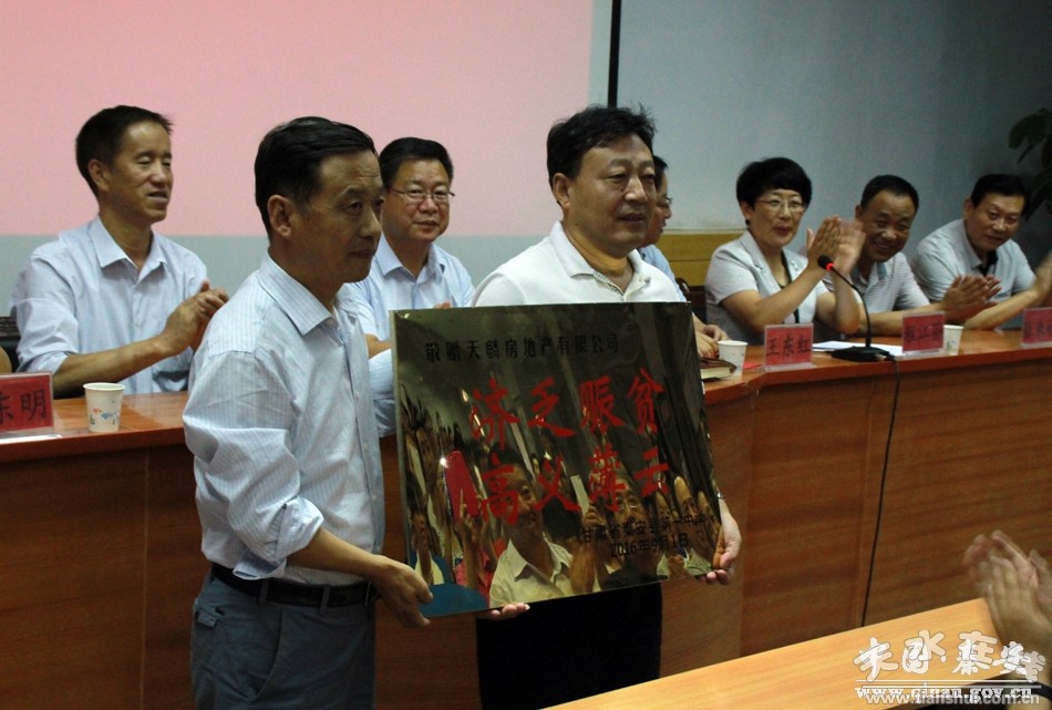 。ǹh一中負責人代表學校向天麟公司贈送“濟乏賑貧、高義薄云”牌匾)