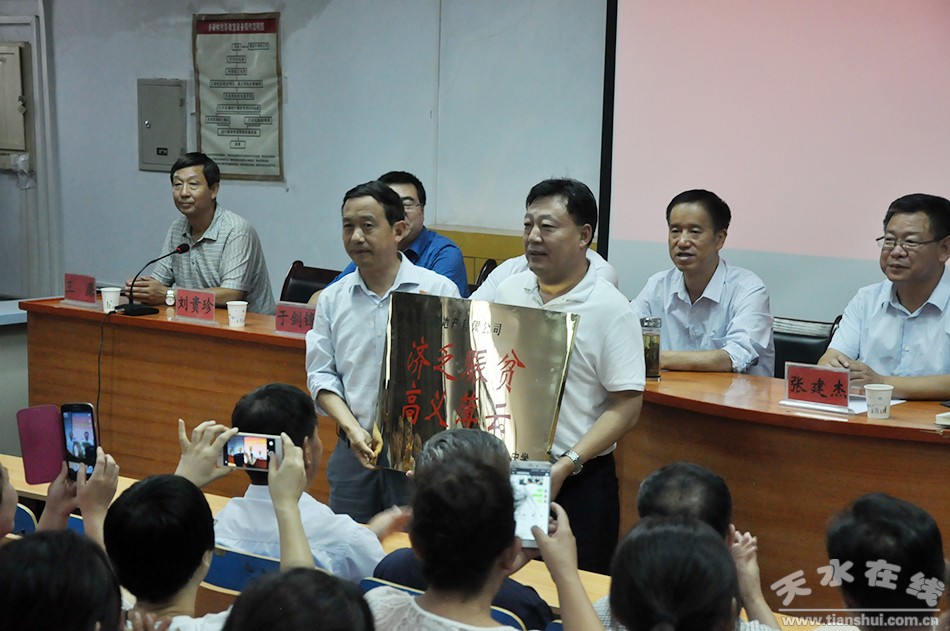 秦安一中校長(zhǎng)劉貴珍代表學(xué)校向天麟公司贈(zèng)送銅牌