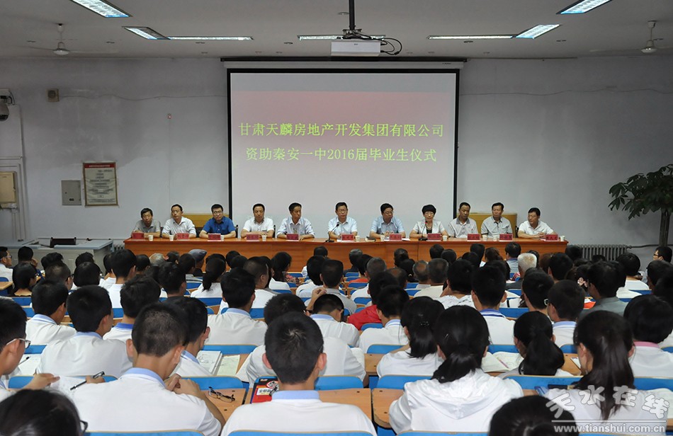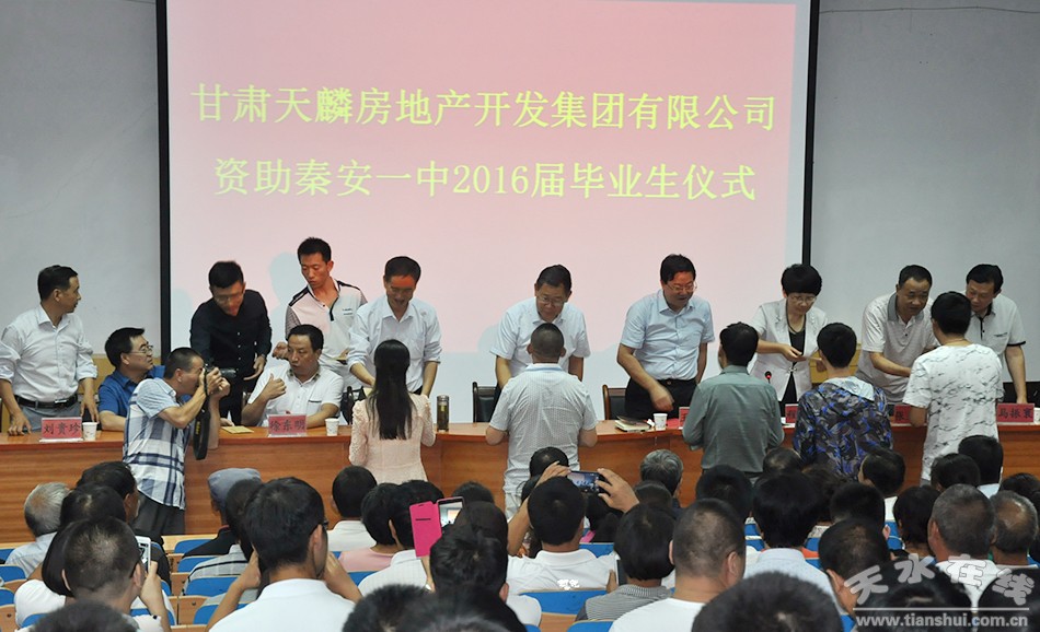 9月2日,甘肅天麟房地產(chǎn)開(kāi)發(fā)集團(tuán)有限公司資助秦安一中2016屆畢業(yè)生儀式在秦安縣一中舉行。市政府副市長(zhǎng)張建杰出席儀式并講話。市教育局局長(zhǎng)蘇定武,秦安縣委書記王東紅,秦安縣委副書記、縣長(zhǎng)程江芬及四大組織分管領(lǐng)導(dǎo),天麟集團(tuán)董事長(zhǎng)候天才,教師學(xué)生代表,受資助的學(xué)生及家長(zhǎng)參加了儀式。