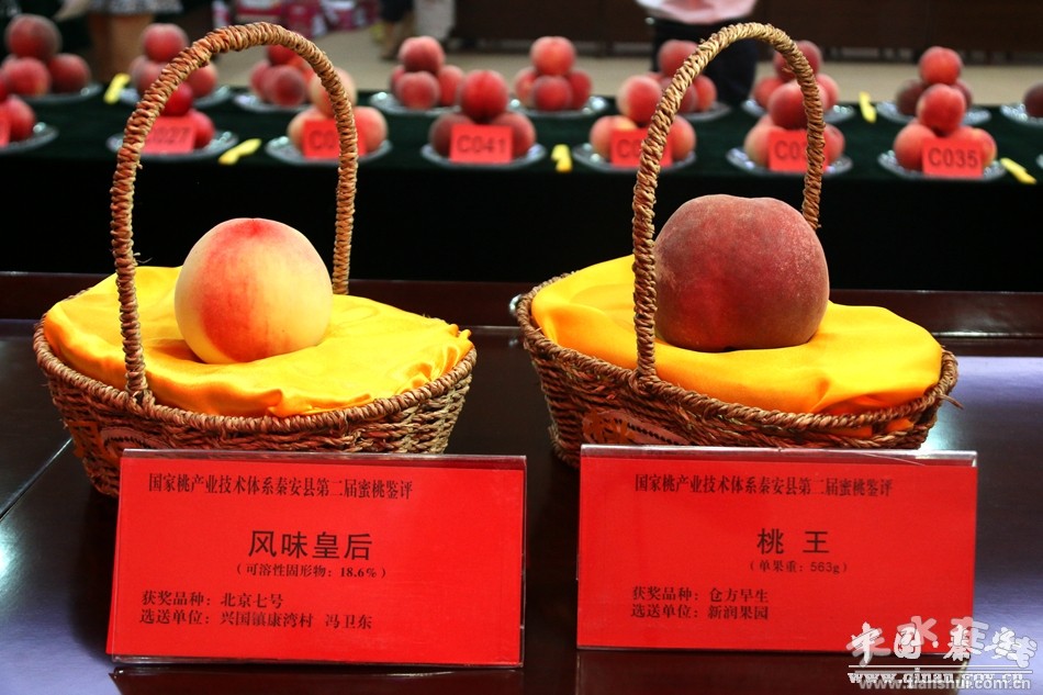 2016年8月,國家桃產(chǎn)業(yè)技術(shù)體系秦安縣第二屆蜜桃鑒評暨提質(zhì)增效生產(chǎn)技術(shù)培訓(xùn)會成功舉辦。國家桃產(chǎn)業(yè)技術(shù)體系崗位科學(xué)家、甘肅省農(nóng)科院、天水師院、天水市果業(yè)產(chǎn)業(yè)辦、正大集團(tuán)北京正大果業(yè)公司的相關(guān)專家對進(jìn)入復(fù)賽的60份蜜桃樣品進(jìn)行了現(xiàn)場鑒評,評選出桃王獎1個、風(fēng)味皇后獎1個、金獎3個、銀獎6個、銅獎9個!疤彝酹劇,單果重563g,由秦安縣新潤果園獲得;“風(fēng)味皇后獎”,可溶性固形物18.6%,最后“桃王”被園集團(tuán)以10500元成交,“風(fēng)味皇后”被天麟集團(tuán)以11000元的價格成交。