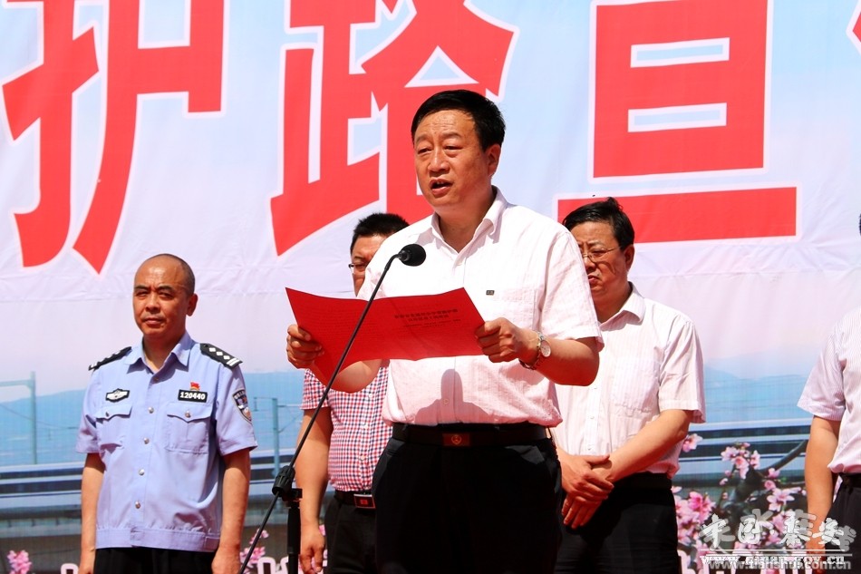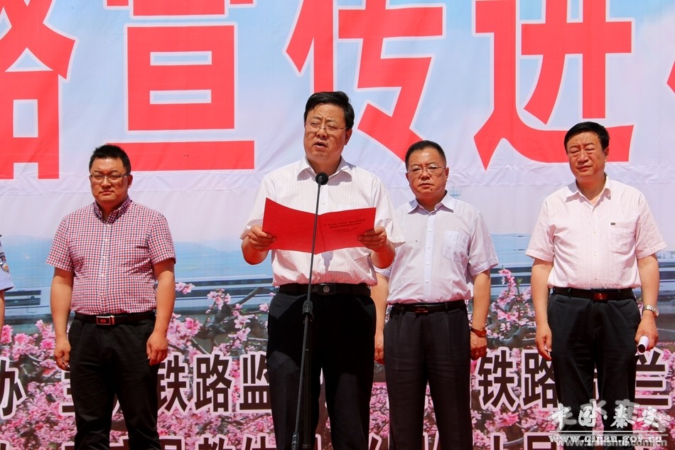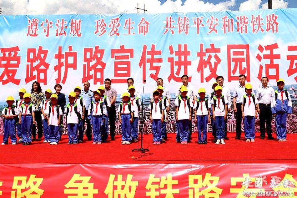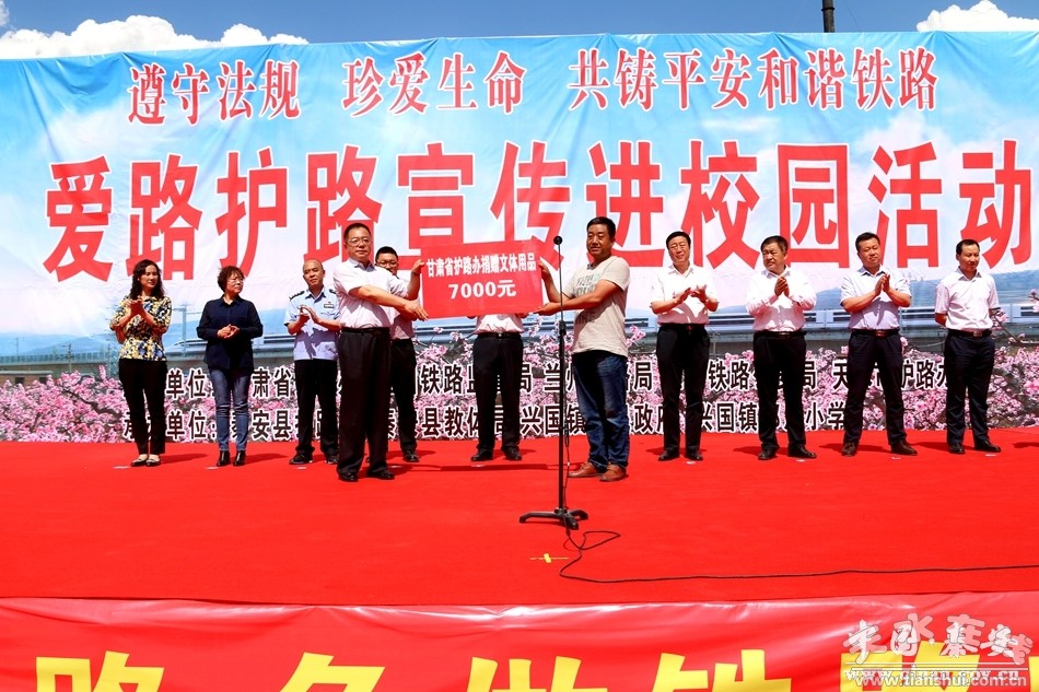 6月6日,省市縣三級(jí)“遵守法規(guī)、珍愛(ài)生命、共鑄平安和諧鐵路”愛(ài)路護(hù)路宣傳進(jìn)校園活動(dòng)在秦安縣興國(guó)鎮(zhèn)鄭川小學(xué)舉行。省護(hù)路辦常務(wù)副主任李寶林,蘭州鐵路監(jiān)管局法制處副處長(zhǎng)石明敏,蘭州鐵路公安處治安支隊(duì)副支隊(duì)長(zhǎng)王麟,天水市委政法委副書(shū)記、綜治辦主任、護(hù)路辦主任陳璧田,秦安縣委書(shū)記王東紅,縣委常委、政法委書(shū)記楊喜春,縣委常委、興國(guó)鎮(zhèn)黨委書(shū)記王明,縣人大常委會(huì)副主任王蓉,縣政府副縣長(zhǎng)張海龍,縣政協(xié)副主席逯虹及興國(guó)、西川、葉堡、郭嘉、王鋪等鎮(zhèn)負(fù)責(zé)人,縣公安局、工商局、交通局、住建局、國(guó)土局、水務(wù)局、團(tuán)縣委、安監(jiān)局等相關(guān)部門(mén)負(fù)責(zé)人、鄭川小學(xué)全體師生參加了活動(dòng)。