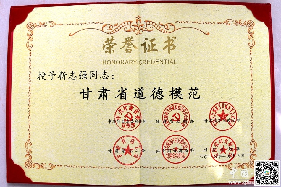 在2017年5月啟動的“德耀中華”第六屆全國道德模范評選活動中,靳志強(qiáng)入圍全國助人為樂模范候選人,其照片、基本情況和事跡簡介于7月24日、25日刊登在人民日報、解放軍報、光明日報、經(jīng)濟(jì)日報上。7月24日至8月23日,中央人民廣播電臺在中國之聲、經(jīng)濟(jì)之聲、都市之聲、音樂之聲、中國鄉(xiāng)村之聲等頻率展播候選人廣播節(jié)目;中央電視臺在新聞頻道展播候選人電視專題片;中國文明網(wǎng)、人民網(wǎng)、新華網(wǎng)、光明網(wǎng)、中國經(jīng)濟(jì)網(wǎng)、中國網(wǎng)絡(luò)電視臺、中國青年網(wǎng)、央廣網(wǎng)、中國軍網(wǎng)、中工網(wǎng)、中國婦女網(wǎng)同步展示候選人事跡。