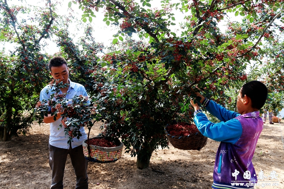 秦安縣氣候溫和,日照充足,降水較少,干旱頻繁,夏無酷暑、冬無嚴(yán)寒,夏濕冬干,大陸性季風(fēng)氣候比較顯著。這里干旱少雨的氣候特點(diǎn),限制了小麥作物的種植,農(nóng)民種小麥也只能種一季!胺N小麥一畝地能收300斤,一年只能種一季,300斤小麥差不多能賣300元,這還不如種一棵花椒樹的收入!备拭C盛源菊香農(nóng)業(yè)發(fā)展有限公司總經(jīng)理王斌告訴記者,而一畝地至少可以種植40棵花椒樹,算下來經(jīng)濟(jì)效益是種一畝小麥?zhǔn)杖氲?0倍。于是他以公司名義聯(lián)合秦安當(dāng)?shù)?80戶農(nóng)民,建立了5000畝花椒基地,這幾年風(fēng)調(diào)雨順,花椒抗旱能力強(qiáng),又連年喜獲豐收。2017年,該公司的花椒收入就有6000萬元,380戶農(nóng)民一年戶均收入達(dá)到4萬元。