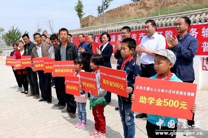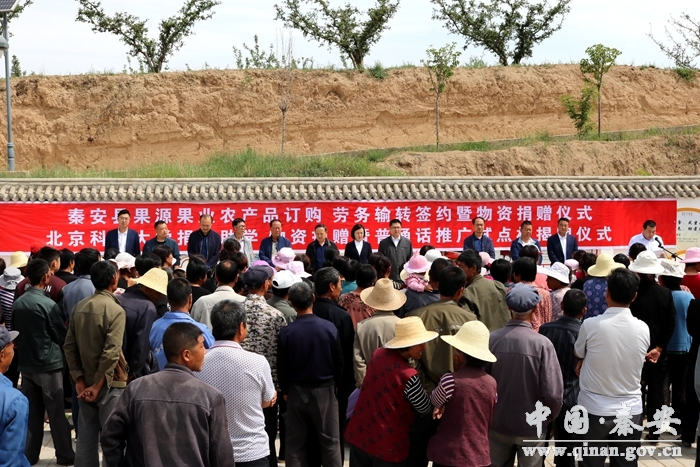 儀式上,秦安縣果源果業(yè)專業(yè)合作社與小莊村簽訂了農(nóng)產(chǎn)品收購和勞務(wù)輸轉(zhuǎn)合同,并以市場收購價提前訂購全村300多戶村民的蘋果;與會領(lǐng)導(dǎo)代表北京科技大學(xué)公益組織向貧困戶轉(zhuǎn)贈了一批有機農(nóng)藥,向梁山小學(xué)轉(zhuǎn)贈了500冊勵志圖書,為村民發(fā)放果源果業(yè)專業(yè)合作社捐贈的13噸化肥,并向北京科技大學(xué)愛心人士“一對一”資助的10名貧困生頒發(fā)愛心助學(xué)金,同時,還為普通話推廣試點村揭牌?h委常委、組織部長肖江作了講話。