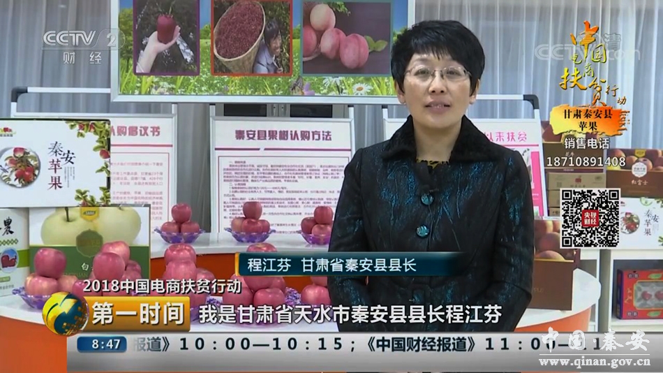 中央電視臺(tái)財(cái)經(jīng)頻道聯(lián)合商務(wù)部、財(cái)政部、國(guó)務(wù)院扶貧辦等部門(mén),舉辦“2018中國(guó)電商扶貧行動(dòng)”,展播特色扶貧縣的電商扶貧活動(dòng),秦安縣成功入選“全國(guó)百家電商扶貧特色縣區(qū)”,并由政府主要領(lǐng)導(dǎo)推介當(dāng)?shù)貞?yīng)季農(nóng)產(chǎn)品。