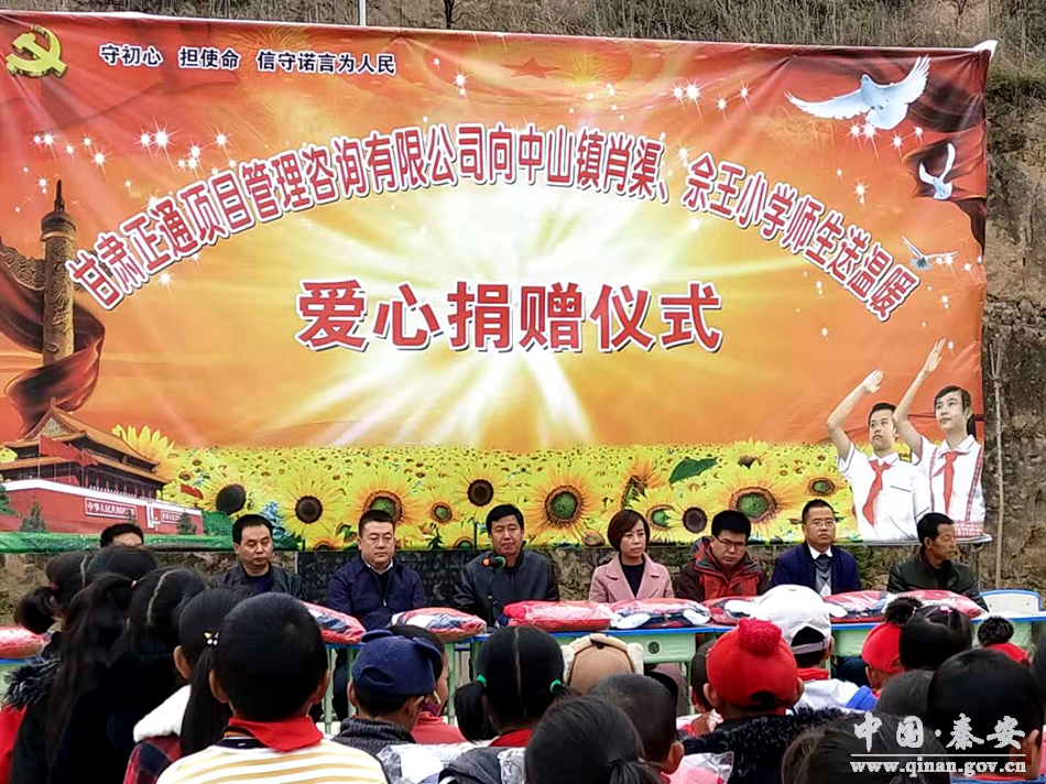 11月8日是立冬的第一天,經中山鎮(zhèn)黨委、政府牽線搭橋,甘肅省正通項目管理咨詢有限公司雪中送炭,為中山鎮(zhèn)肖渠小學、佘王小學兩校師生捐贈價值8萬余元的棉衣145件,在寒冬來臨之際為山區(qū)孩子送去了溫暖。