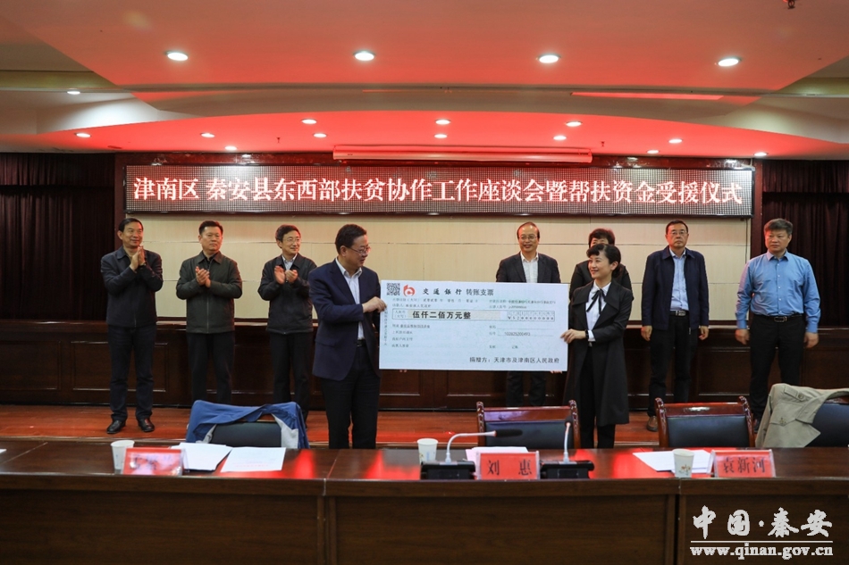 在隨后召開的津南區(qū)秦安縣東西部扶貧協(xié)作工作座談會暨幫扶資金受援儀式上,與會人員觀看了2019年津南區(qū)秦安縣東西部扶貧協(xié)作工作紀實片,向貧困學生代表發(fā)放了“微心愿”包。津南區(qū)向秦安縣交接了財政援助資金5200萬元、鎮(zhèn)級幫扶資金150萬元和津南區(qū)慈善協(xié)會援助資金105萬元。