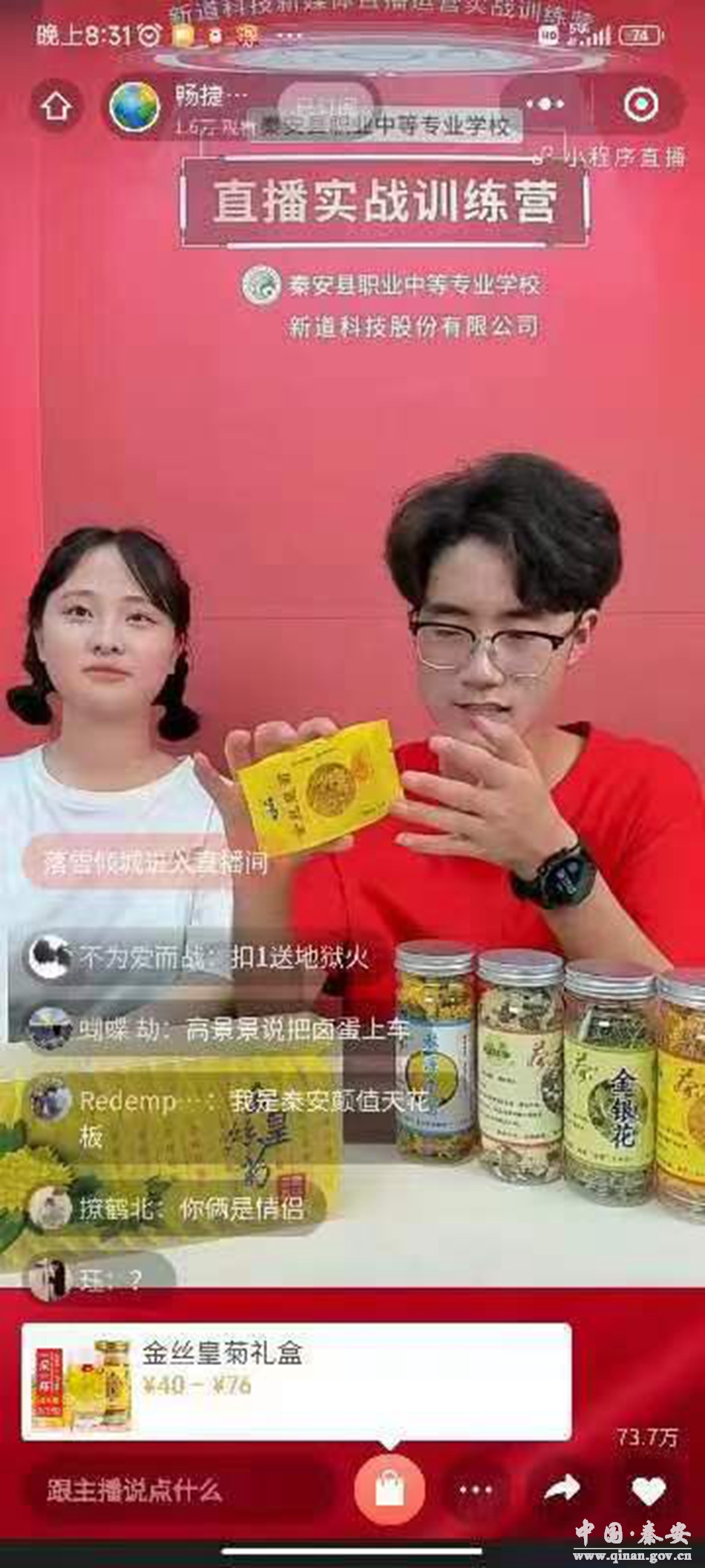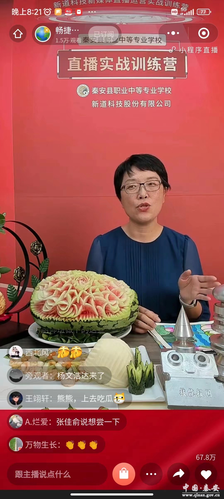 “我們共有8組48名學(xué)生參加了此次活動(dòng),既有助于提高學(xué)生的專業(yè)技能水平,又增強(qiáng)了社會(huì)實(shí)踐能力。同時(shí),直播也讓秦安更多的優(yōu)質(zhì)農(nóng)產(chǎn)品被大家知曉!鼻匕部h職業(yè)中等專業(yè)學(xué)校校長劉學(xué)穎告訴記者。