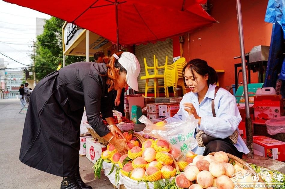 在秦安縣夜市一條街上走過(guò),一筐筐鮮嫩的桃子整齊地?cái)[放著,濃郁的桃香撲鼻而來(lái),吸引了不少市民購(gòu)買(mǎi)嘗鮮。