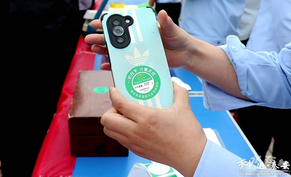 “叔叔,您手機凈重220克,以后購物時,遇到商家使用電子秤稱量商品時,您只要把手機直接放到電子秤上稱一下,看稱重結(jié)果與手機標(biāo)簽重量是否一致,就可以知道商家的秤是否標(biāo)準(zhǔn)了!惫ぷ魅藛T一邊耐心向市民解釋“手機變砝碼”小妙招的使用方法,一邊將秦安縣質(zhì)量技術(shù)監(jiān)督檢測所統(tǒng)一印制的綠色克重標(biāo)簽貼在市民手機背面。