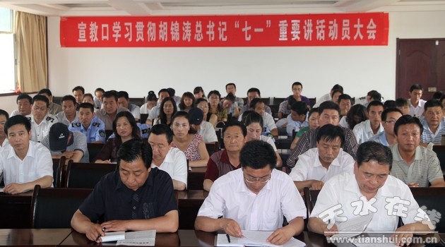 (清水縣委對外宣傳辦公室 楊兆康 張建新 趙麗)7月12日,清水縣在教體局會(huì)議室召開宣教口學(xué)習(xí)貫徹胡錦濤總書記在慶祝中國共產(chǎn)黨成立90周年大會(huì)上的講話精神動(dòng)員大會(huì),落實(shí)縣委常委會(huì)議精神,進(jìn)一步動(dòng)員宣教口全體干部職工以飽滿的熱情,積極投身到學(xué)習(xí)貫徹胡錦濤總書記重要講話中來,不斷推動(dòng)宣教口各單位各項(xiàng)工作跨越式科學(xué)發(fā)展。