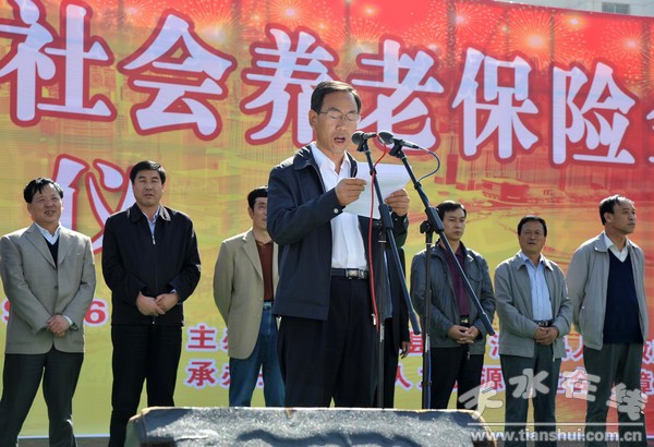 清水縣委書(shū)記劉天波作了重要講話。劉天波指出: 開(kāi)展城鄉(xiāng)居民養(yǎng)老保險(xiǎn)試點(diǎn),是黨中央、國(guó)務(wù)院在實(shí)現(xiàn)“種地不交稅、上學(xué)不交費(fèi)、看病不太貴”的基礎(chǔ)上,為加快建設(shè)覆蓋城鄉(xiāng)居民社會(huì)保障體系作出的一項(xiàng)重大決策,對(duì)于實(shí)現(xiàn)享有基本養(yǎng)老保險(xiǎn),切實(shí)改善民生、促進(jìn)社會(huì)和諧,加快全面建設(shè)小康社會(huì),讓城鄉(xiāng)居民進(jìn)一步實(shí)現(xiàn)“養(yǎng)老不犯愁”的夢(mèng)想,具有非常重要的現(xiàn)實(shí)意義和極其深遠(yuǎn)的歷史意義。