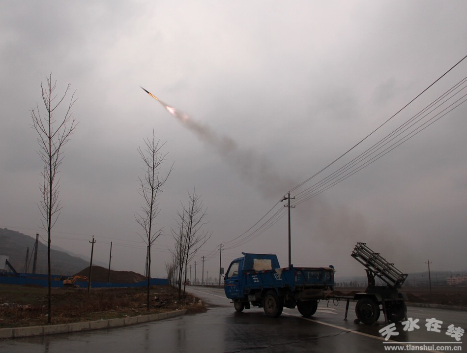 3月25日下午,清水縣下起了小雨,下午五點半,空氣濕度超過70%,符合人工增雨條件,該縣及時搶抓這個有利條件,成功發(fā)射6枚增雨火箭彈進行人工增雨作業(yè)。縣委書記劉天波親臨現(xiàn)場指導人工增雨工作。