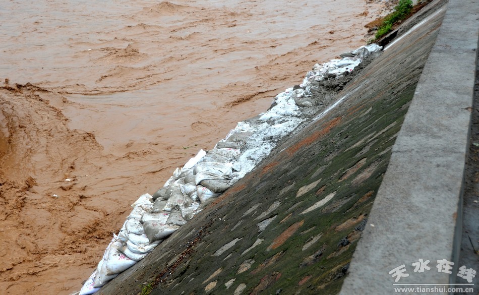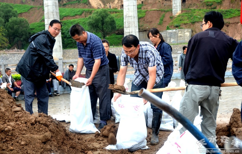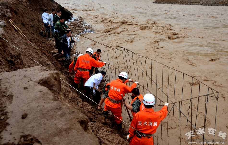 這次降雨,使清水縣多條河流水位普遍上漲,水流更加湍急,對(duì)堤岸的沖刷驟然加劇,水毀河堤區(qū)段汛情十分危急。在冒雨深入南道河沿線詳細(xì)察看之后,劉天波立即加入到緊急救援搶險(xiǎn)隊(duì)伍當(dāng)中,與大家一道揮鍬鏟土,裝運(yùn)沙袋,并率先踏進(jìn)水毀河堤,搬運(yùn)沙包,組織搶險(xiǎn)隊(duì)伍開(kāi)展河堤搶修工作?吹娇h委書(shū)記劉天波在救災(zāi)一線身先士卒搬運(yùn)沙袋,搶險(xiǎn)隊(duì)員和當(dāng)?shù)厝罕娚钍芄奈,立即振作精神,全身心投入搶修工作?dāng)中,僅一上午,就將受災(zāi)最嚴(yán)重的幾處河堤修補(bǔ)加固,減輕了洪水對(duì)河堤和公路路基的沖刷。在搶修河堤的同時(shí),劉天波還指導(dǎo)水利和交通部門,在南道河受災(zāi)最重的區(qū)段,開(kāi)辟了一條臨時(shí)便道,以方便當(dāng)?shù)厝罕姵鲂小?/FONT>
