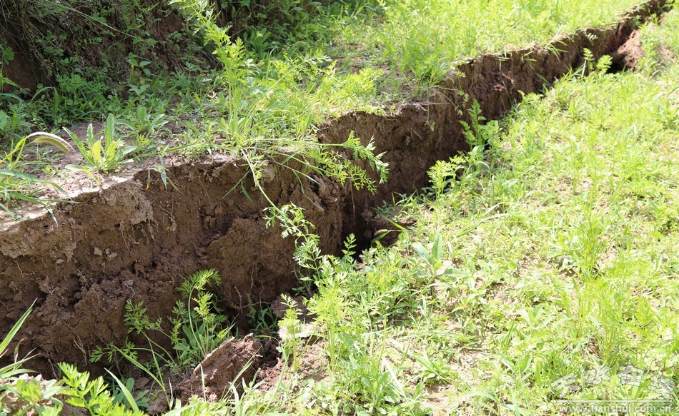 (夜明村曹王自然村所在的山體嚴(yán)重滑坡,山體下滑近兩米,山坡出現(xiàn)很多大裂縫一直延伸到村莊,曹王自然村整個(gè)村莊處在危險(xiǎn)地帶)