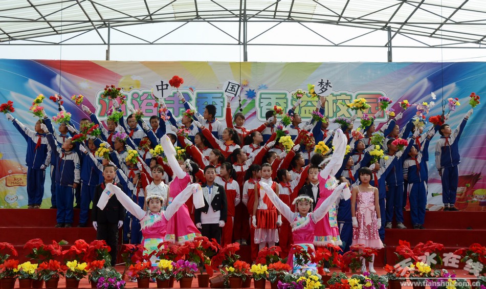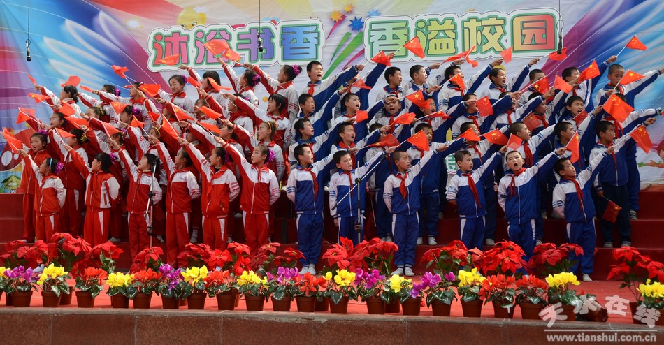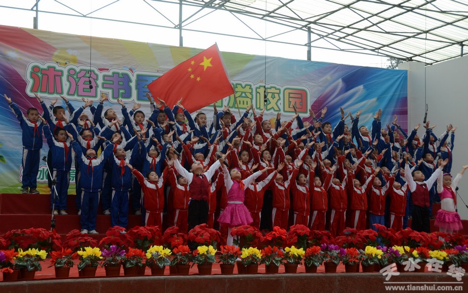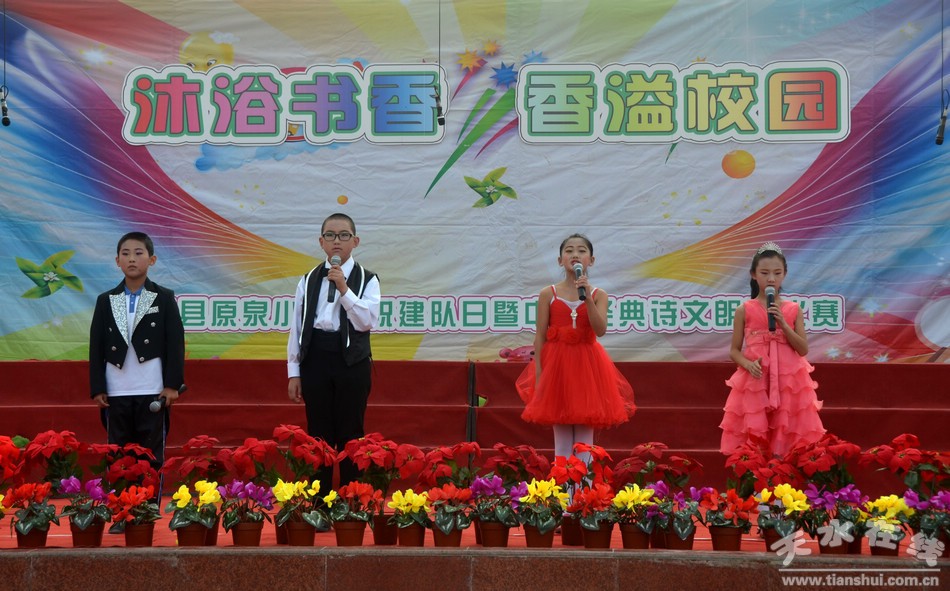 在清水縣原泉小學(xué)中國(guó)經(jīng)典詩(shī)文朗讀比賽現(xiàn)場(chǎng):“我驕傲,我是中國(guó)人”,“我們有一個(gè)共同的名字叫中國(guó)、我們有一個(gè)共同的母親叫中國(guó)”!白鎳(guó)啊,我們偉大的母親,您向新世紀(jì)走來(lái),又大踏步地走向?qū)儆谀拿魈,祝福你啊,祖?guó)”!拔业募t領(lǐng)巾,你是紅旗的一角,革命先烈的血將你染成,鮮紅的紅領(lǐng)巾承載了我們的中國(guó)夢(mèng)!中國(guó)夢(mèng)、加油!紅領(lǐng)巾相約中國(guó)夢(mèng)”等一句句感人肺腑的話語(yǔ)響徹校園,余音裊裊,不絕如縷,抒發(fā)了全體師生立志報(bào)效祖國(guó)的情懷。