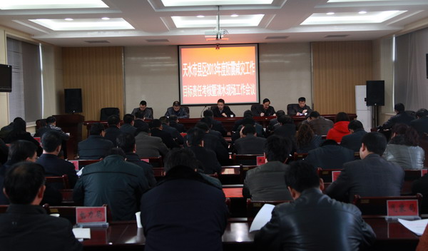 現(xiàn)場(chǎng)考核檢查結(jié)束后,召開(kāi)了全市2013度縣區(qū)防震減災(zāi)工作目標(biāo)責(zé)任考核暨清水現(xiàn)場(chǎng)考核匯報(bào)會(huì),會(huì)議聽(tīng)取了清水縣防震減災(zāi)工作開(kāi)展情況的匯報(bào),全面總結(jié)了2013年防震減災(zāi)工作取得的成績(jī),查找工作中存在的薄弱環(huán)節(jié),全面研究安排明年各項(xiàng)防震減災(zāi)工作任務(wù)。市地震局局長(zhǎng)馬文學(xué)主持考核匯報(bào)會(huì)。