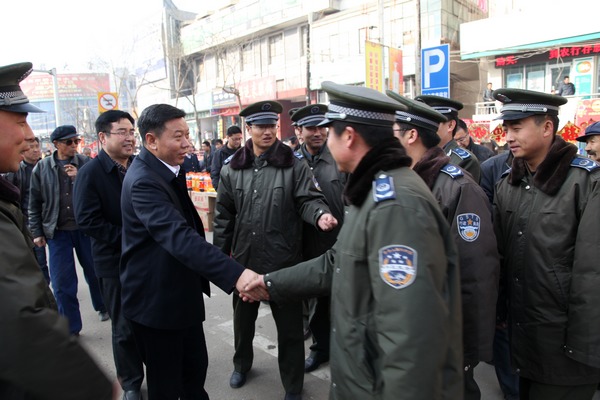 進(jìn)入臘月,置辦年貨的城鄉(xiāng)群眾日益增多,年集市場火熱,城市綜合管理任務(wù)艱巨。馬越垠在西關(guān)十字與正在上街執(zhí)法的縣綜合執(zhí)法局干部逐一握手,祝他們節(jié)日快樂,對節(jié)日期間還要堅守崗位,維護(hù)城市良好秩序表示感謝。