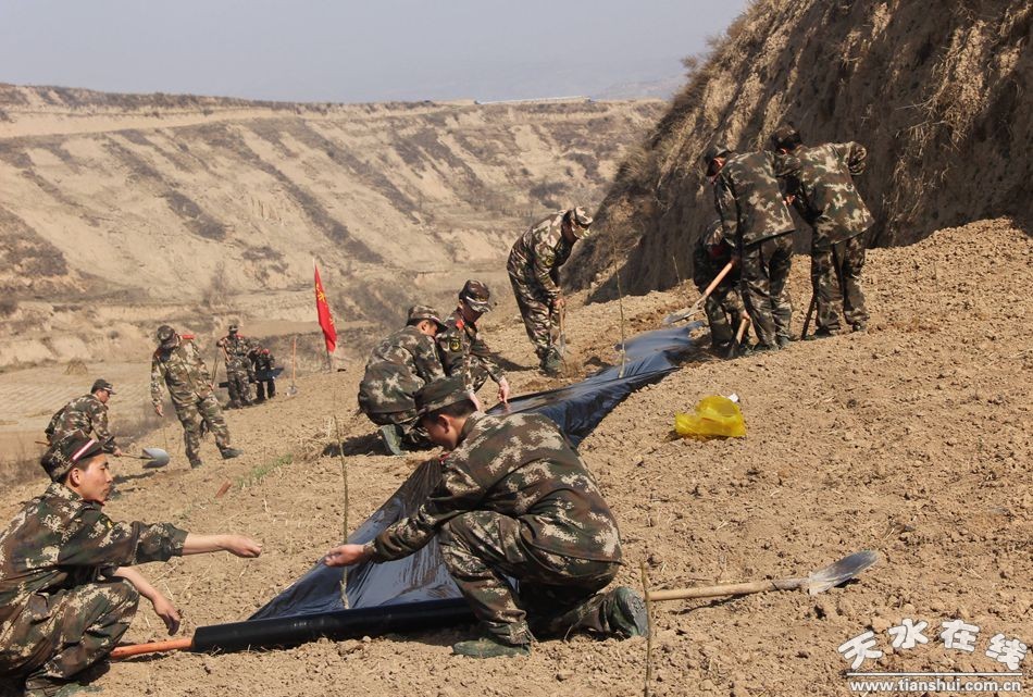 (近日,清水縣組織縣直六大口2683名干部職工在西靈山幫建核桃園。圖為武警清水縣中隊官兵在西靈山上幫建核桃園現(xiàn)場)