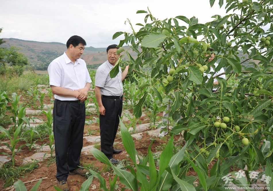 在西靈山現(xiàn)代農(nóng)業(yè)科學發(fā)展示范點,劉天波實地察看了示范區(qū)內(nèi)的核桃生長情況、果園管理情況及道路等基礎(chǔ)設(shè)施建設(shè)情況。看到西靈山5萬畝核桃基地里核桃樹長勢良好,很多核桃樹已經(jīng)掛果,部分核桃樹上沉甸甸的果實壓彎了樹枝,農(nóng)民們在一片片果園里套種了全膜玉米和半夏,果園管理更加精細化,農(nóng)民增收的基礎(chǔ)更加堅實。劉天波高興地說,這一棵棵核桃樹就是農(nóng)民增收致富奔小康的希望,一定要把這些希望之樹管護好,讓致富的金果掛滿枝頭。各相關(guān)部門和鄉(xiāng)鎮(zhèn)要切實加強示范區(qū)道路等基礎(chǔ)設(shè)施建設(shè),充分發(fā)動群眾加強果園綜合管理,合理間作套種,切實讓果園建一片、鞏固一片、見效一片,真正把核桃產(chǎn)業(yè)打造成為農(nóng)民增收致富的搖錢樹。