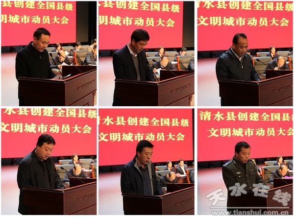 清水縣委書記劉天波出席會議并講話,縣委副書記、縣長馬越垠主持會議,縣委常委、宣傳部長張秀麗宣讀《中共清水縣委清水縣人民政府關(guān)于創(chuàng)建全國縣級文明城市工作實施方案》,縣委政法委、住建局、教體局、工商局、永清鎮(zhèn)等5個部門的負(fù)責(zé)人和綜合執(zhí)法局干部職工代表做了表態(tài)發(fā)言。