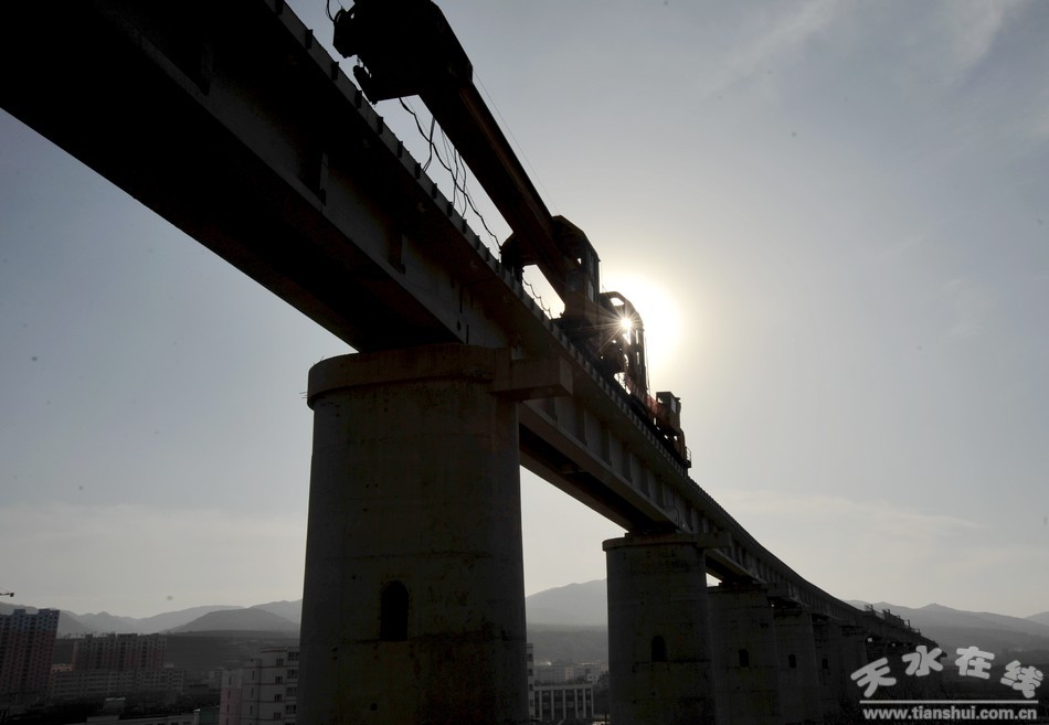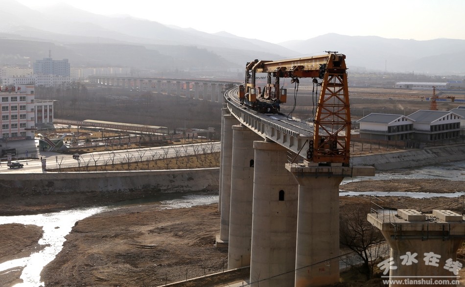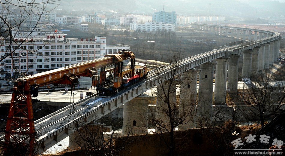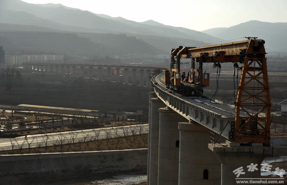近日,在天平鐵路清水縣城牛頭河段上,中鐵21局項(xiàng)目部架橋班的工人們正在高空鋪設(shè)軌道,場(chǎng)面十分壯觀。