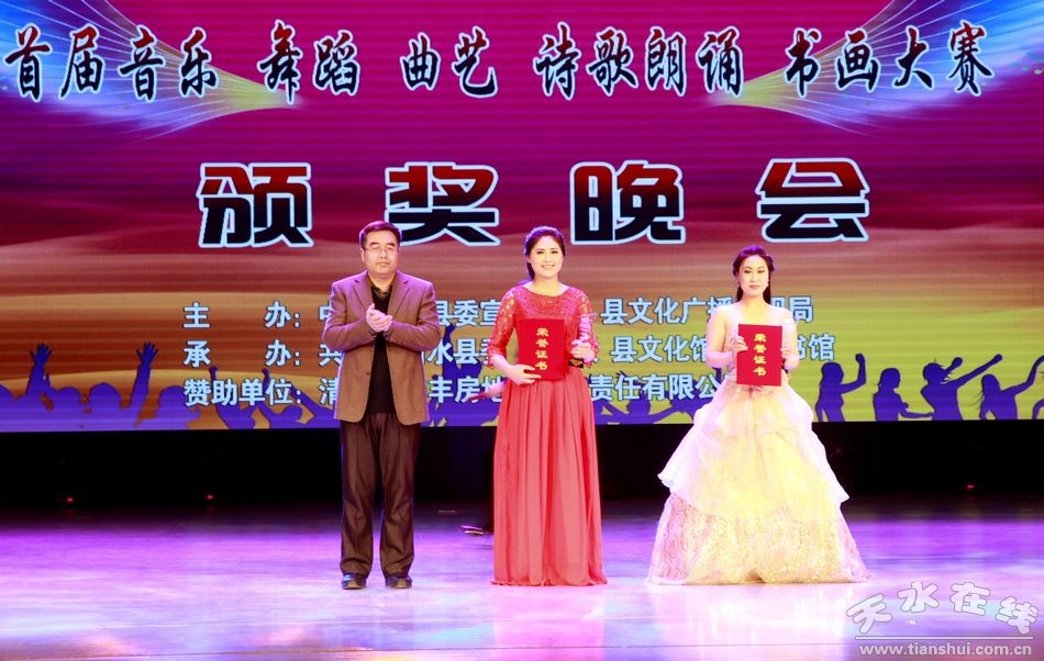 3月3日晚,清水縣首屆音樂、 舞蹈 、曲藝、 詩歌朗誦及書畫大賽頒獎晚會在軒轅大劇院精彩上演?h四大組織在家領(lǐng)導(dǎo),縣直各單位負責(zé)人,獲獎人員共計800余人參加頒獎晚會。