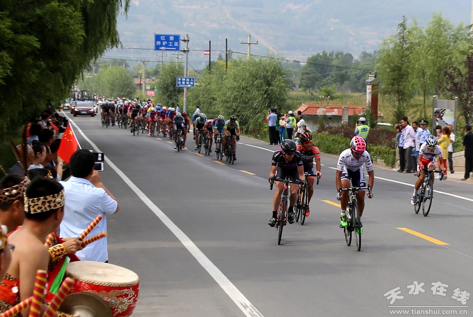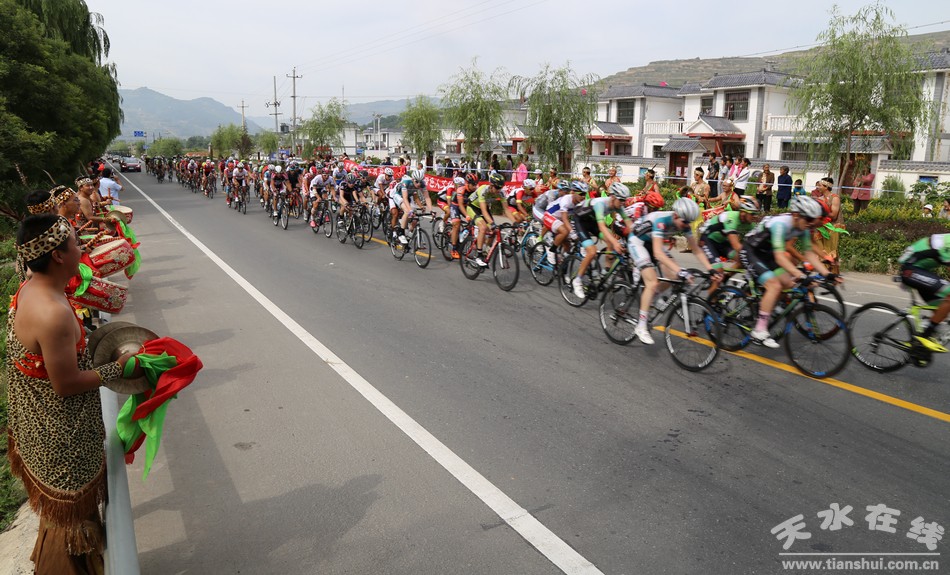 7月16日上午,2015年第十四屆“青海農(nóng)信杯”環(huán)青海湖國(guó)際公路自行車賽第十一賽段天水至平?jīng)龅谋荣愅緩杰庌@故里清水縣,在該縣美麗鄉(xiāng)村示范帶杜川村新農(nóng)村文化廣場(chǎng),清水軒轅鼓舞以其恢弘的氣勢(shì)、壯觀的場(chǎng)面助陣環(huán)湖賽。同時(shí),吸引了眾多隨行媒體記者的拍攝。