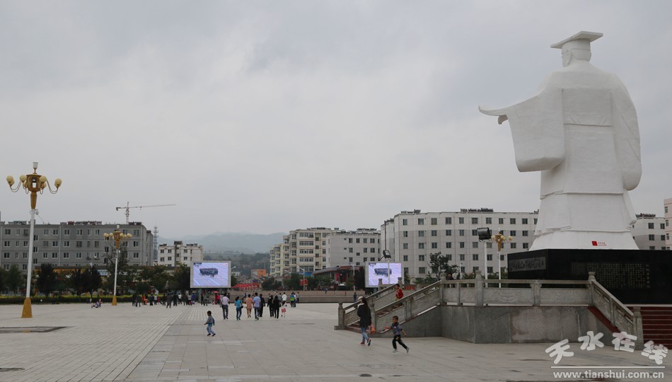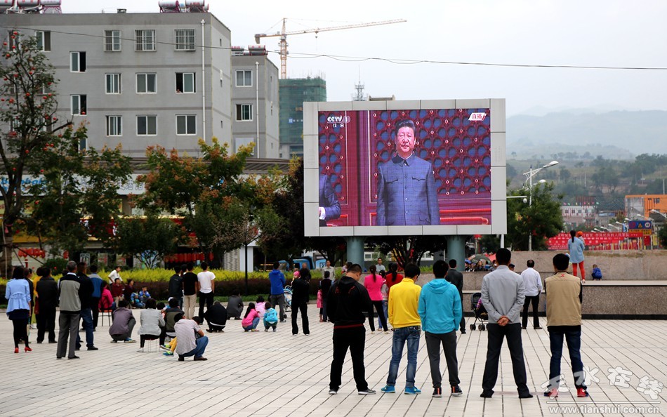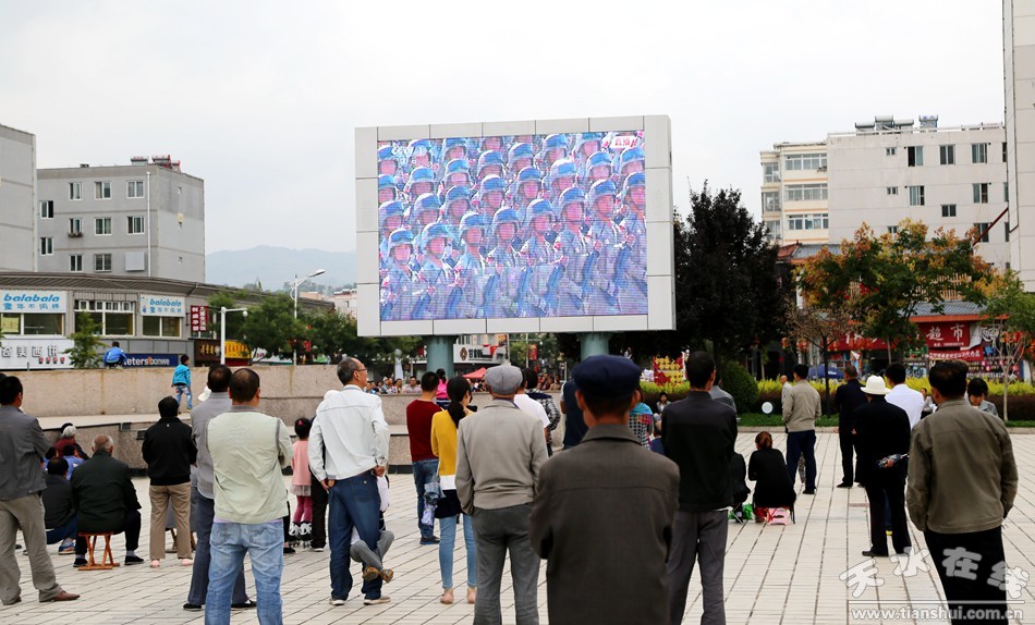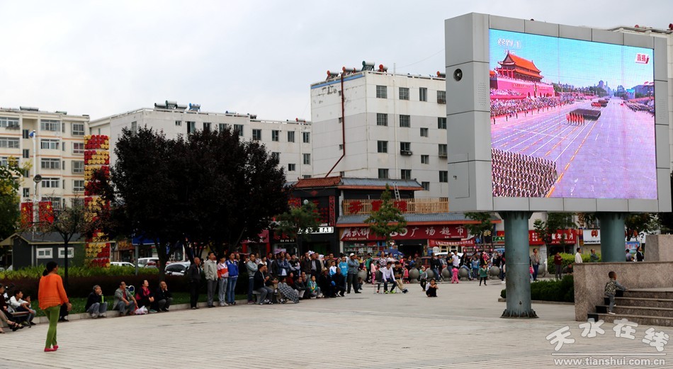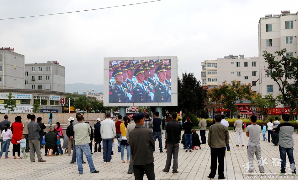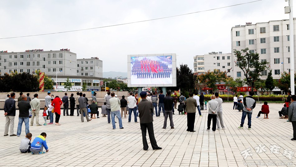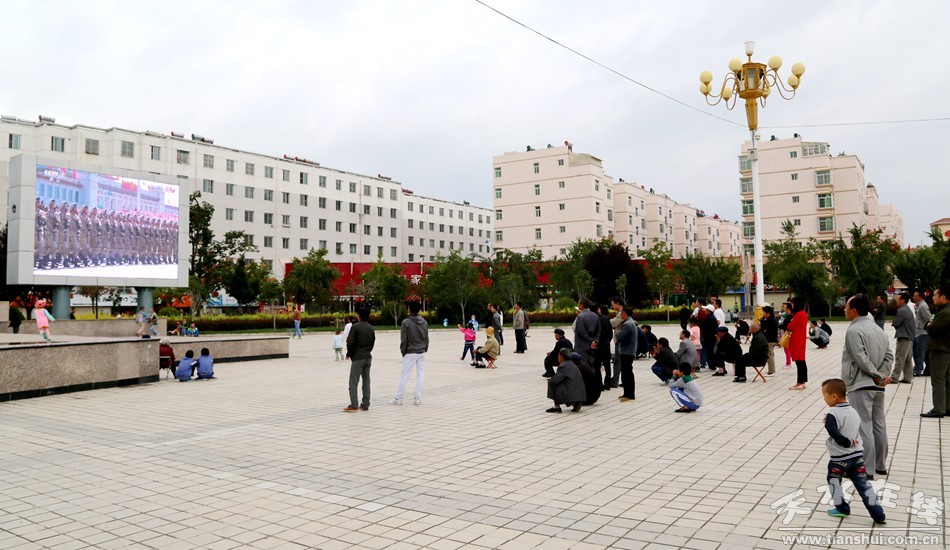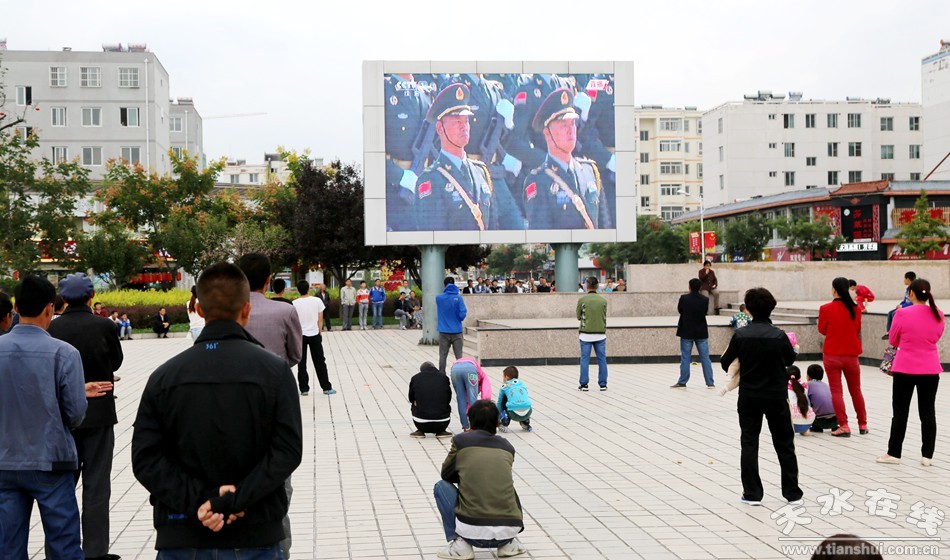 (9月3日上午,清水市民聚集在軒轅廣場上觀看閱兵現(xiàn)場直播)