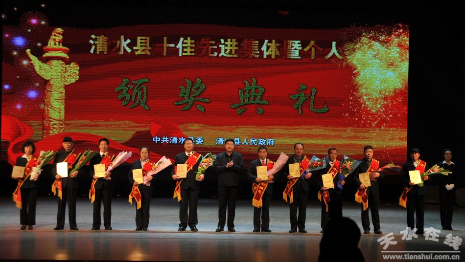 14、1月22日,清水縣隆重舉行“十佳先進集體暨個人”表彰大會,縣委書記劉天波致辭。表彰大會由縣委副書記、縣長馬越垠主持;縣委副書記王新強宣讀了縣委縣政府關(guān)于“十佳先進集體暨個人”的表彰決定;縣四大組織領(lǐng)導(dǎo)分別為十佳先進集體暨個人頒獎。