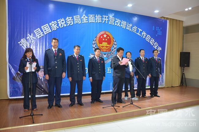 5月1日零時(shí),清水縣舉行全面推開營(yíng)改增試點(diǎn)工作啟動(dòng)儀式?h委常委、常務(wù)副縣長(zhǎng)牛永禎出席啟動(dòng)儀式并講話。縣財(cái)政、國(guó)稅、地稅等部門主要負(fù)責(zé)人和國(guó)稅局全體干部職工參加啟動(dòng)儀式。