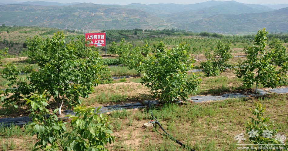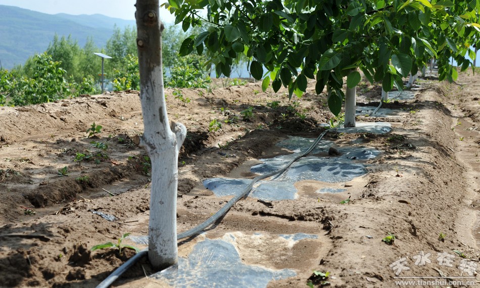 近日,在清水縣西靈山5萬(wàn)畝核桃產(chǎn)業(yè)示范園區(qū),筆者看到,一畝畝核桃園枝繁葉茂,綠意盎然,繁星似的核桃掛滿了枝頭。在核桃園內(nèi),一根根灌溉網(wǎng)管縱橫交錯(cuò),水通過(guò)灌溉網(wǎng)管流進(jìn)了一棵棵核桃樹!暗嗡喔炔粌H節(jié)水高效,還能夠防止核桃園的土壤板結(jié),對(duì)核桃樹的成長(zhǎng)和掛果起到了很好的作用,”西靈山節(jié)水灌溉工程負(fù)責(zé)人介紹說(shuō)。
