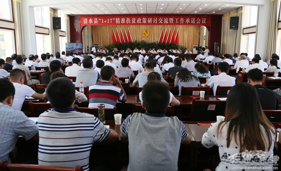 7月4日,清水縣召開(kāi)“1+17”精準(zhǔn)扶貧政策研討交流暨工作承諾會(huì)議?h四大組織全體在家領(lǐng)導(dǎo);縣法院院長(zhǎng)、檢察院檢察長(zhǎng),公安局局長(zhǎng)、政委;18鄉(xiāng)鎮(zhèn)黨委書(shū)記、鄉(xiāng)鎮(zhèn)長(zhǎng);全縣“1+17”方案牽頭部門(mén)和責(zé)任單位主要負(fù)責(zé)人;縣直各部門(mén)、駐縣有關(guān)單位主要負(fù)責(zé)人,18鄉(xiāng)鎮(zhèn)和“1+17”方案重點(diǎn)單位精準(zhǔn)扶貧業(yè)務(wù)人員,共計(jì)180多人參加會(huì)議。清水縣各鄉(xiāng)鎮(zhèn)、縣直各部門(mén)設(shè)立分會(huì)場(chǎng),組織全體干部職工在本單位收聽(tīng)收看電視直播。