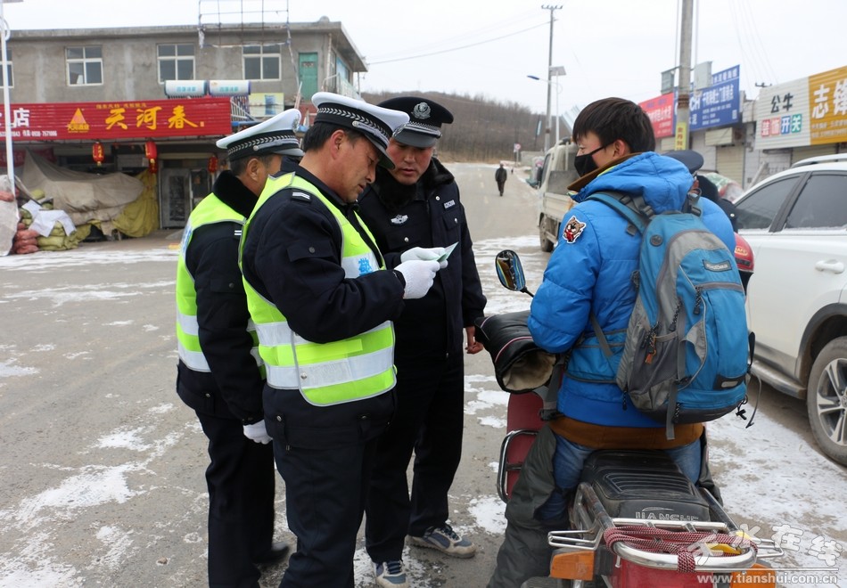 11月22日上午,由土門鄉(xiāng)安監(jiān)、派出所、交管站、交警中隊(duì)全體成員組成聯(lián)合執(zhí)法勸導(dǎo)隊(duì),在沿305線、清秦路、林土路等3條主要交通干道現(xiàn)場執(zhí)法勸導(dǎo),排查交通安全隱患,提醒駕駛員注意慢行,采取加掛防滑鏈等防范措施,并對三輪車違規(guī)載人、摩托車非法載人的行為進(jìn)行現(xiàn)場處置。與此同時,該鄉(xiāng)13個行政村采取高音喇叭宣傳、設(shè)立臨時勸導(dǎo)點(diǎn)在各自的區(qū)域內(nèi)開展勸導(dǎo)工作。截止目前,土門鄉(xiāng)共出動交通安全勸導(dǎo)人員24人,發(fā)放勸導(dǎo)通知書106份,現(xiàn)場處置違規(guī)駕駛行為3起,并由交警中隊(duì)3名成員在土門梁市場進(jìn)行全天執(zhí)勤,確保特殊天氣下全鄉(xiāng)交通安全。