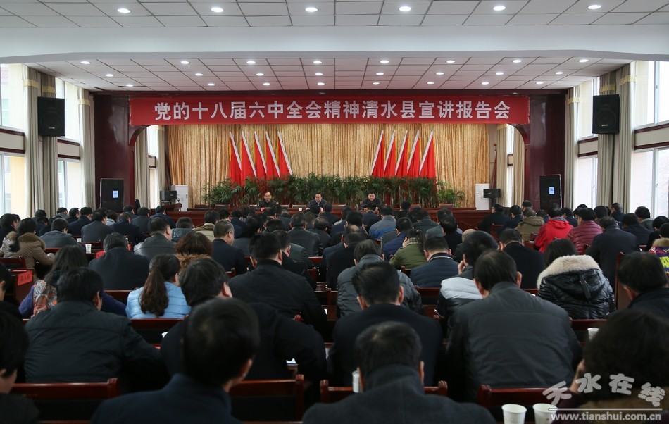 市人大常委會(huì)副主任、清水縣委書記劉天波主持會(huì)議。市政協(xié)副主席、黨組副書記王振宇出席會(huì)議;馬越垠、周偉東、丁旺喜等縣四大組織在家領(lǐng)導(dǎo);縣法院院長、檢察院檢察長,公安局政委;縣人大各工委主任、政協(xié)各專委主任;各鄉(xiāng)鎮(zhèn)黨委書記,縣直有關(guān)單位黨委書記、黨委專職副書記;縣直各單位主要負(fù)責(zé)人共170人聆聽了宣講報(bào)告。