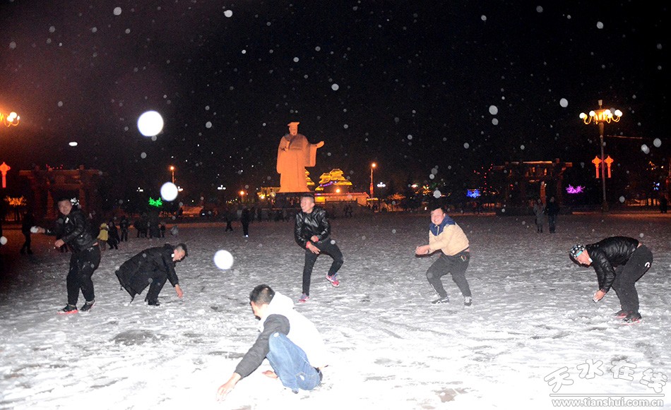 晚上七點以后,雪漸漸停了,忙碌了一天的人們卸下一身的疲憊,走出房子,攜家?guī)Э,享受一片白雪世界帶來的美麗意境,昏暗的天空已看不到大片雪花”簌簌”的飄,軒轅廣場上滿是嬉鬧的人群,以青年男女和小朋友居多,他們堆雪人、打雪仗、滑雪、拍照,歡樂的氣氛讓人在寒冷的冬天感覺到一種熱情。