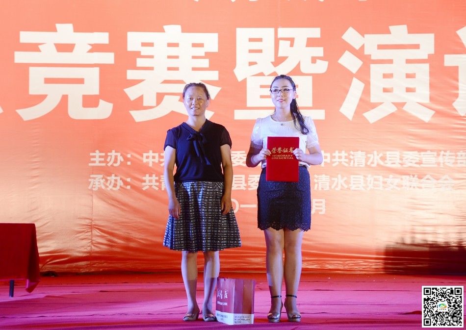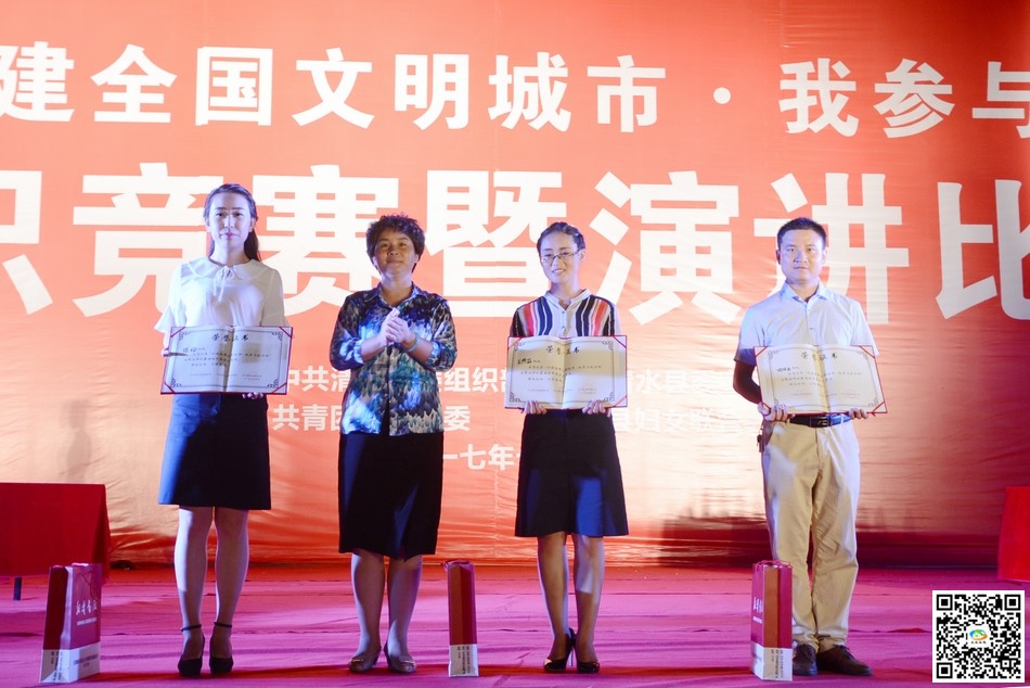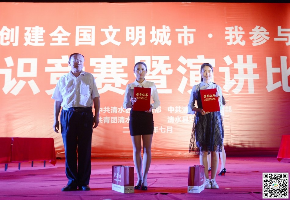 據(jù)了解,本次“創(chuàng)建全國(guó)文明城市 我參與我行動(dòng)”演講比賽由中共清水縣委組織部、中共清水縣委宣傳部主辦,共青團(tuán)清水縣委、清水縣婦女聯(lián)合會(huì)承辦。經(jīng)過(guò)激烈角逐,永清鎮(zhèn)選手獲得一等獎(jiǎng),遠(yuǎn)門(mén)鎮(zhèn)和白駝鎮(zhèn)選手獲得二等獎(jiǎng),郭川鎮(zhèn)、隴東鎮(zhèn)和新城鄉(xiāng)選手獲得三等獎(jiǎng)。