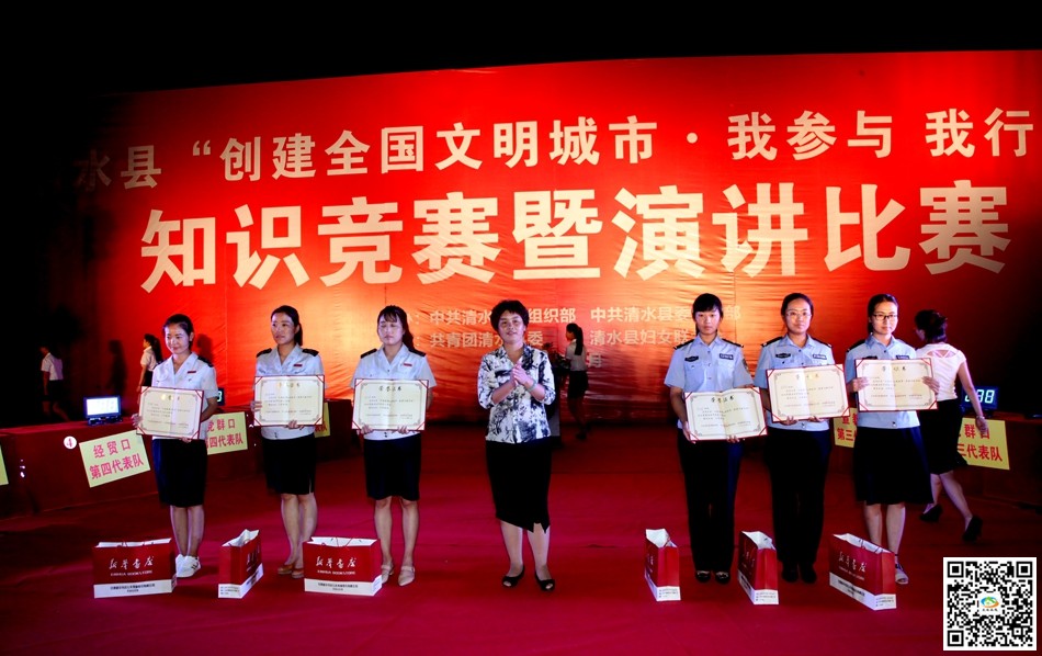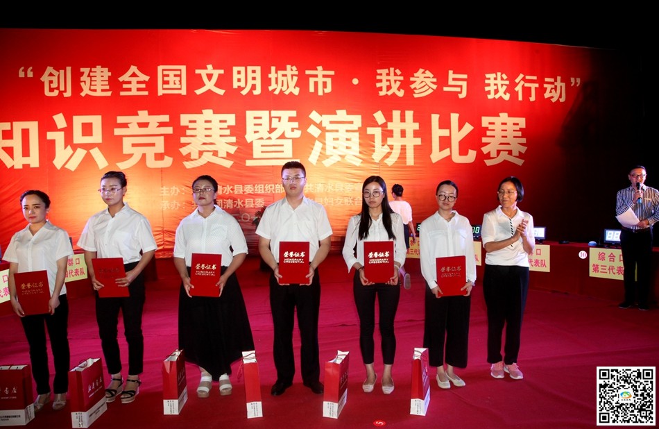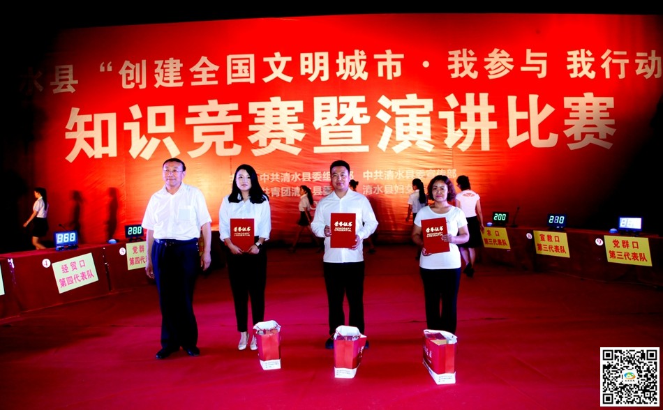 據(jù)了解,本次“清水縣‘創(chuàng)建全國文明城市·我參與我行動 ’知識競賽”活動由中共清水縣委組織部、中共清水縣委宣傳部主辦,共青團(tuán)清水縣委、清水縣婦女聯(lián)合會承辦。在當(dāng)晚舉行的創(chuàng)建全國文明城市?我參與我行動”知識競賽縣直部門決賽第二場,經(jīng)過激烈角逐,最終黨群口三隊(duì)獲得一等獎(jiǎng),政法口三隊(duì)、綜合口三隊(duì)獲得二等獎(jiǎng),宣教口三隊(duì)、政法口四隊(duì)、經(jīng)貿(mào)口三隊(duì)獲得三等獎(jiǎng)。