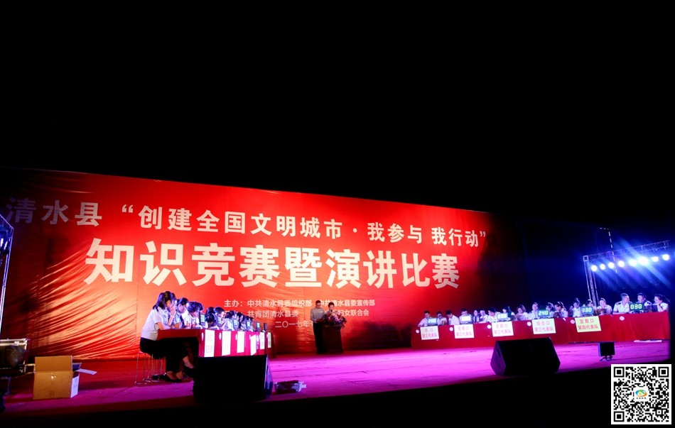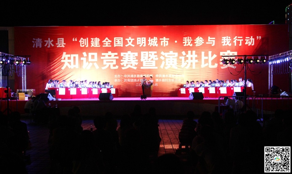 為進(jìn)一步加大創(chuàng)建全國文明城市的宣傳力度,提高廣大市民對創(chuàng)建全國文明城市的知曉率、支持率、參與率,普及創(chuàng)建全國文明城市知識,營造良好的創(chuàng)建氛圍。7月26日晚,清水縣在軒轅廣場隆重舉辦“創(chuàng)建全國文明城市·我參與我行動”知識競賽。
