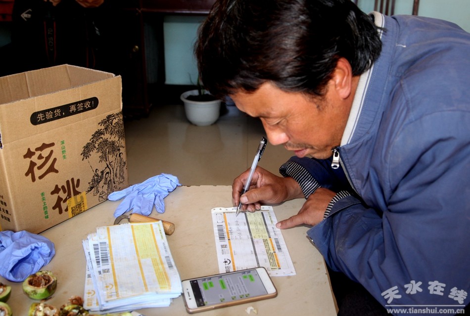 2017這一年,對于田新華來說是值得紀念的年份,這一年,他迎來了自家核桃的大豐收,同時也讓自家的核桃搭上了電商快車遠銷全國各地。田新華每天最忙的就是搗騰手機。所謂微信直銷,就是村民將微信二維碼發(fā)布在天水在線網(wǎng)站平臺,客戶掃碼添加銷售核桃的村民,在微信上商談購買,達成一致后發(fā)微信紅包付款,村民發(fā)貨完成交易。