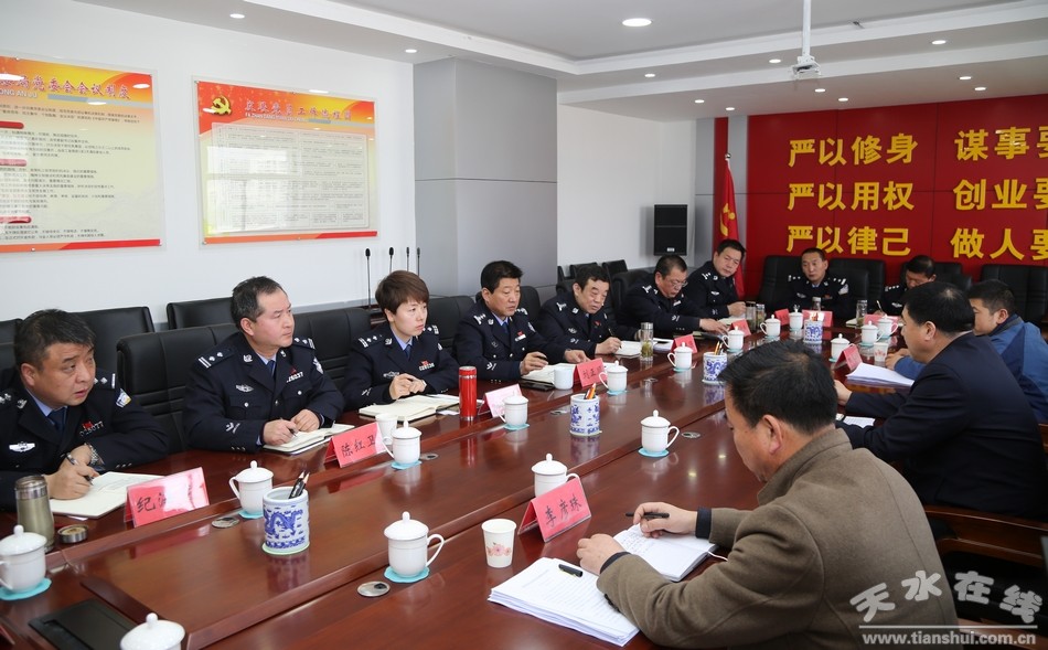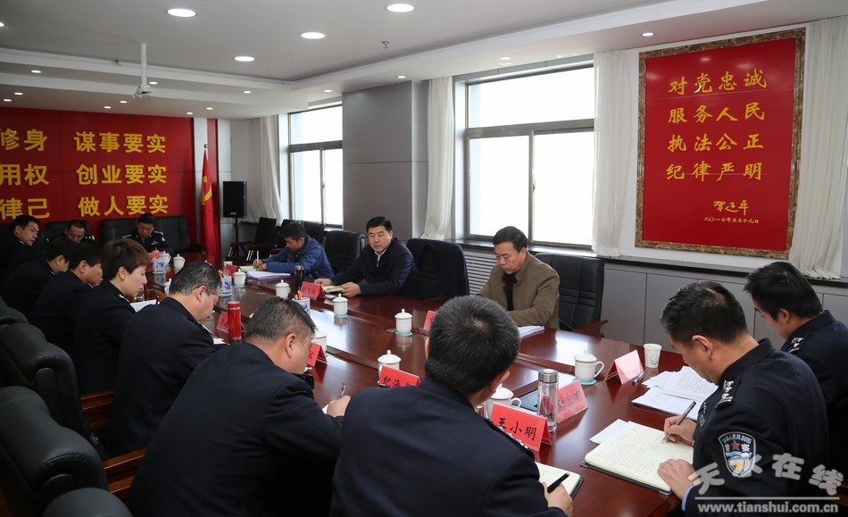 2月9日上午,市人大常委會(huì)副主任、清水縣委書記劉天波參加指導(dǎo)縣公安局黨委班子民主生活會(huì)。他強(qiáng)調(diào),要認(rèn)真學(xué)習(xí)貫徹黨的十九大精神和習(xí)近平新時(shí)代中國特色社會(huì)主義思想,堅(jiān)決落實(shí)習(xí)近平總書記提出的“對(duì)黨忠誠、服務(wù)人民、執(zhí)法公正、紀(jì)律嚴(yán)明”的總要求,努力在新時(shí)代展現(xiàn)公安隊(duì)伍新氣象、實(shí)現(xiàn)公安工作新作為。