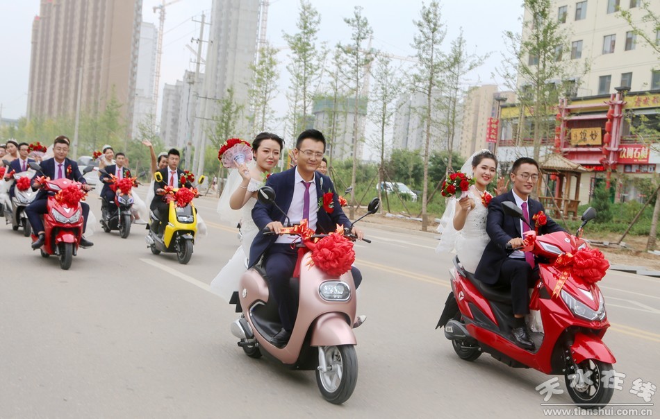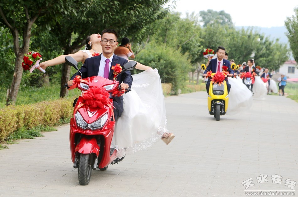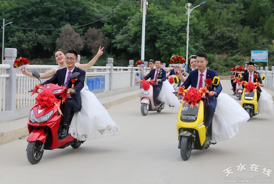 上午9:00,10對(duì)新人騎電動(dòng)車?yán)@軒轅湖公園,經(jīng)軒轅大道、充國廣場(chǎng)、軒轅廣場(chǎng)巡游一圈。9:30分,集體婚禮正式開始,10對(duì)新人在縣四大組織全體在家領(lǐng)導(dǎo),各鄉(xiāng)鎮(zhèn)、各單位負(fù)責(zé)人,現(xiàn)場(chǎng)親朋和鄉(xiāng)親1000余人的共同見證下,邁入幸福的婚姻殿堂。市人大常委會(huì)副主任、清水縣委書記劉天波作了致辭;清水縣人大常委會(huì)主任周偉東為新人證婚并頒發(fā)結(jié)婚證書;縣政協(xié)主席丁旺喜為新人頒發(fā)集體婚禮證書。