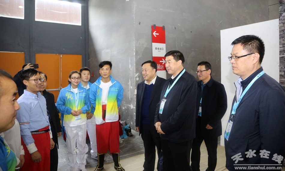 (市人大常委會(huì)副主任、清水縣委書記劉天波,市政府副秘書長(zhǎng)張有信,市體育局局長(zhǎng)黃嘯,縣委常委、宣傳部長(zhǎng)宋賢雄等領(lǐng)導(dǎo)看望慰問(wèn)清水縣非遺項(xiàng)目木人摔跤演職人員)