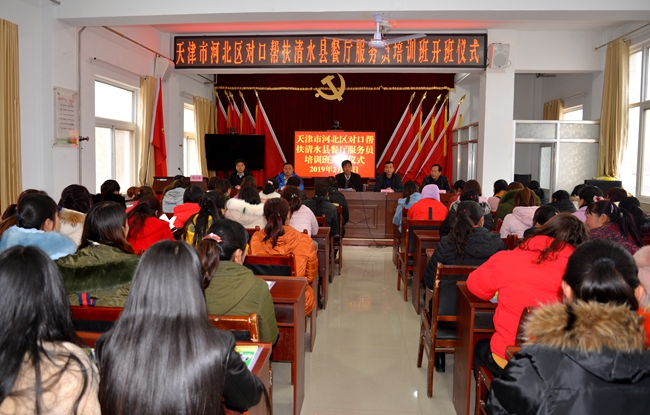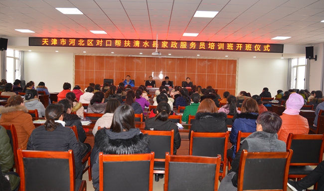 為全面貫徹落實(shí)中央、省市關(guān)于打贏脫貧攻堅(jiān)戰(zhàn)以及東西部扶貧協(xié)作的決策部署和工作要求,全力穩(wěn)定和擴(kuò)大就業(yè),促進(jìn)農(nóng)村勞動(dòng)力特別是建檔立卡貧困勞動(dòng)力轉(zhuǎn)移就業(yè)及農(nóng)民工返鄉(xiāng)創(chuàng)業(yè),2月14日,天津市河北區(qū)人社局對(duì)口幫扶清水縣家政服務(wù)暨餐廳服務(wù)培訓(xùn)班開班,清水縣政府副縣長(zhǎng)馬小平,河北區(qū)就業(yè)訓(xùn)練中心主任劉通,河北區(qū)選派培訓(xùn)教師,縣人社局、永清、白沙兩鎮(zhèn)負(fù)責(zé)人以及培訓(xùn)學(xué)員共200多人參加開班儀式。