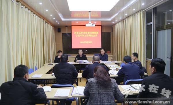 2月25日,清水縣委常委、紀(jì)委書記、監(jiān)委主任馬利民同志主持召開縣紀(jì)委監(jiān)委掃黑除惡專項斗爭工作調(diào)度會議。會議傳達學(xué)習(xí)了習(xí)近平總書記關(guān)于掃黑除惡專項斗爭重要指示、中央省市有關(guān)文件和省紀(jì)委掃黑除惡專項斗爭督導(dǎo)調(diào)研天水市座談會精神,聽取了掃黑除惡專項斗爭工開展情況的匯報,研究分析了專項斗爭工作中存在的問題,安排部署黑除惡專項斗爭下一階段主要工作。